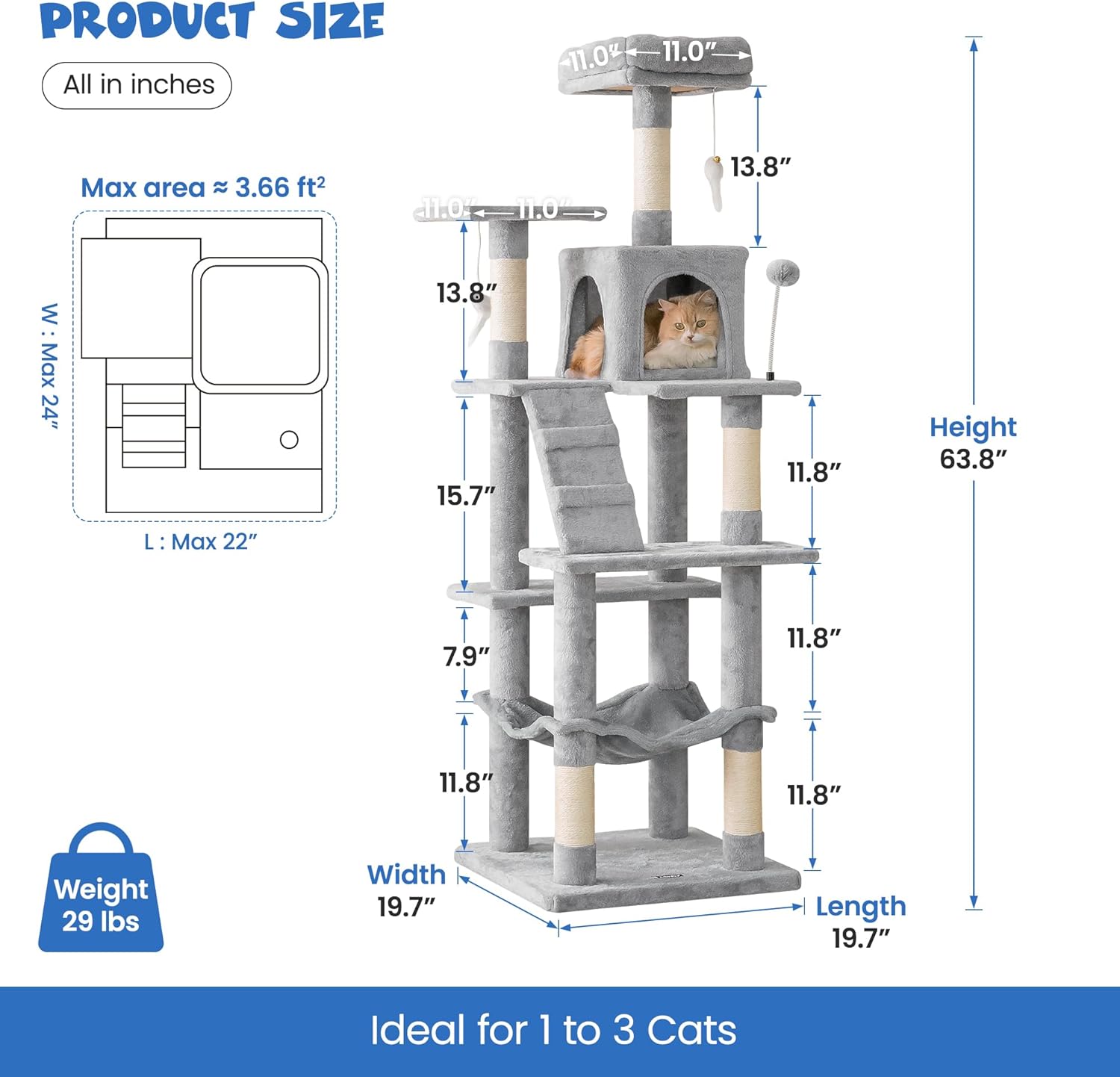 MWPO 63.8 inches Multi-Level Cat Tree for Large Cats with Sisal-Covered Scratching Posts, Padded Platform, Hammock and Condo,Stable Cat Tower Cat Condo Pet Play House-Light Gray