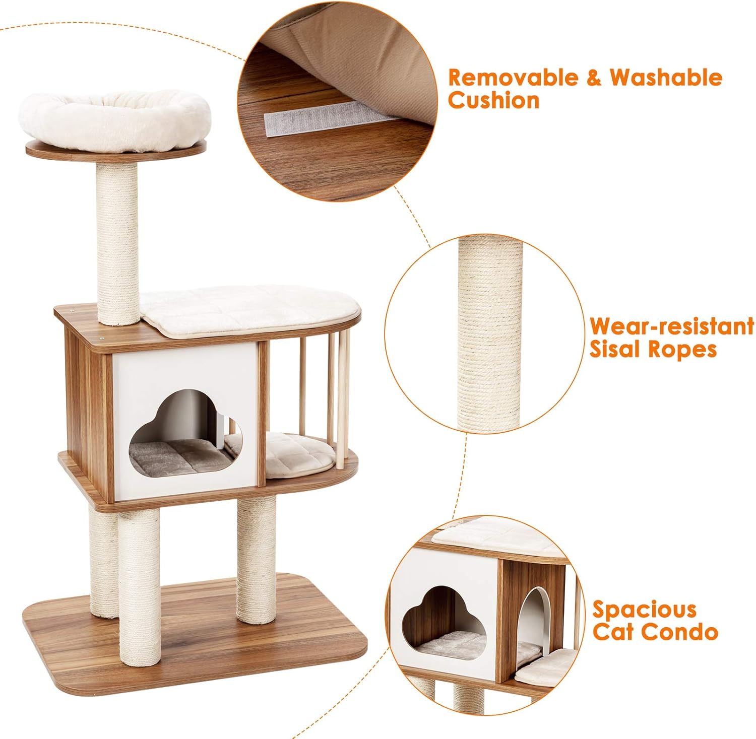 Tangkula Modern Wood Cat Tree, 46 Inches Cat Tower with Platform, Cat Activity Center with Scratching Posts and Washable Cushions, Wooden Cat Condo Furniture for Kittens and Cats (Natural)