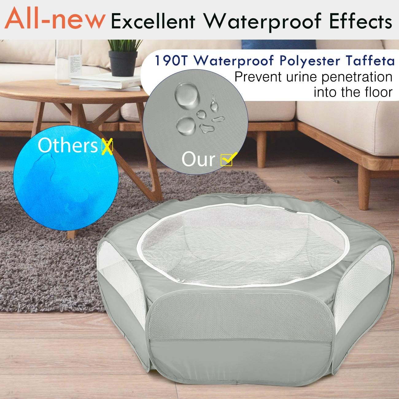 • 【 NO MESS - WATERPROOF DESIGN γ€‘οΌš190T Waterproof Polyester Taffeta with the bottom of the playpen, effectively prevents urine penetration into the floor. The top mesh with a dual-zippered opening is easy to clean and allows power cords to pass through. (NOTE: For your small pet animals' health, please clean up the water stain in time.)