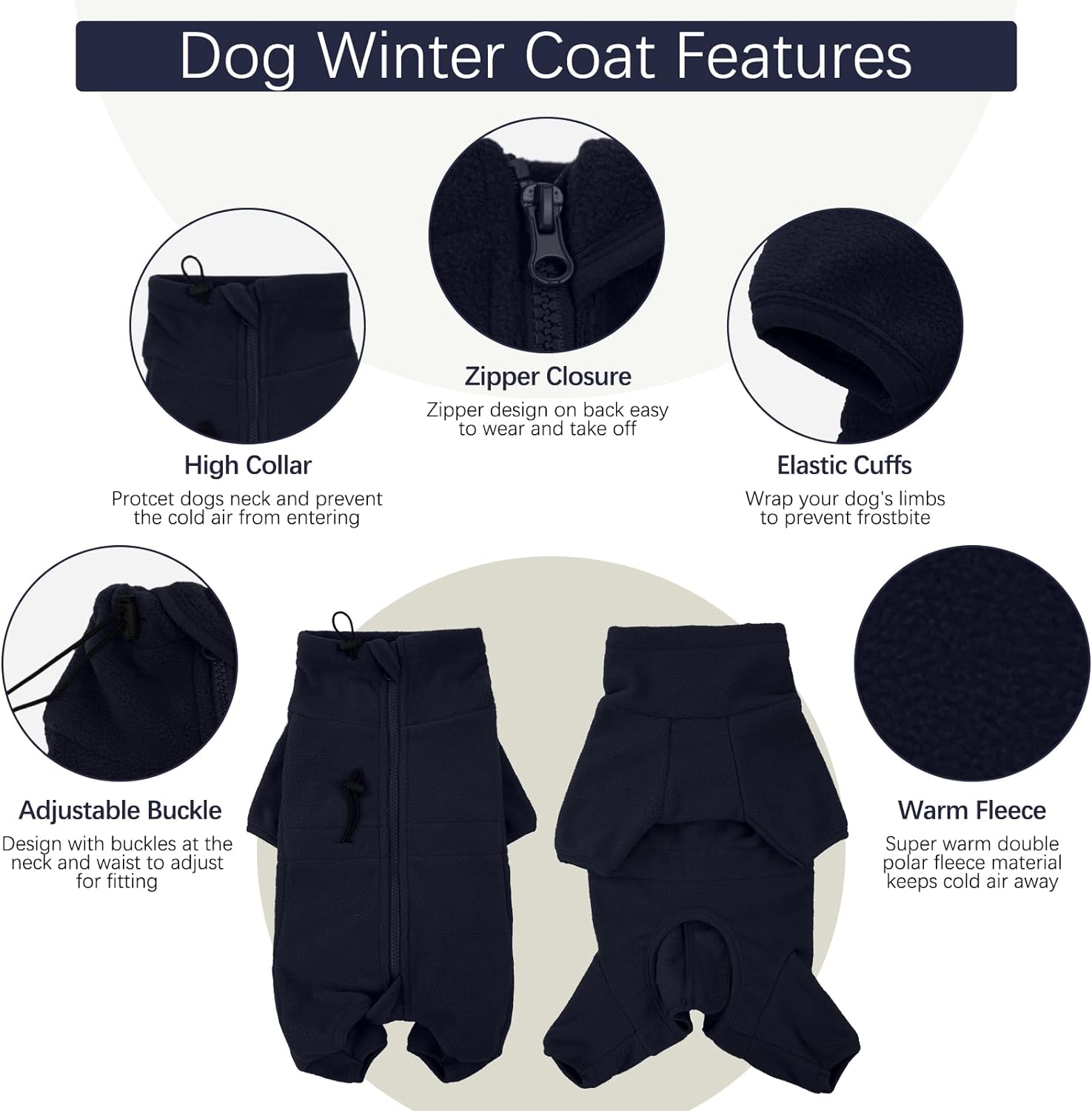 • Warm Material: The dog full body coat is made from thick polar fleece; soft and warm; resistant to falling off or fluffing; offers strong elasticity; Keep your furry dog feel as comfortable as possible, and has a strong warmth in the winter