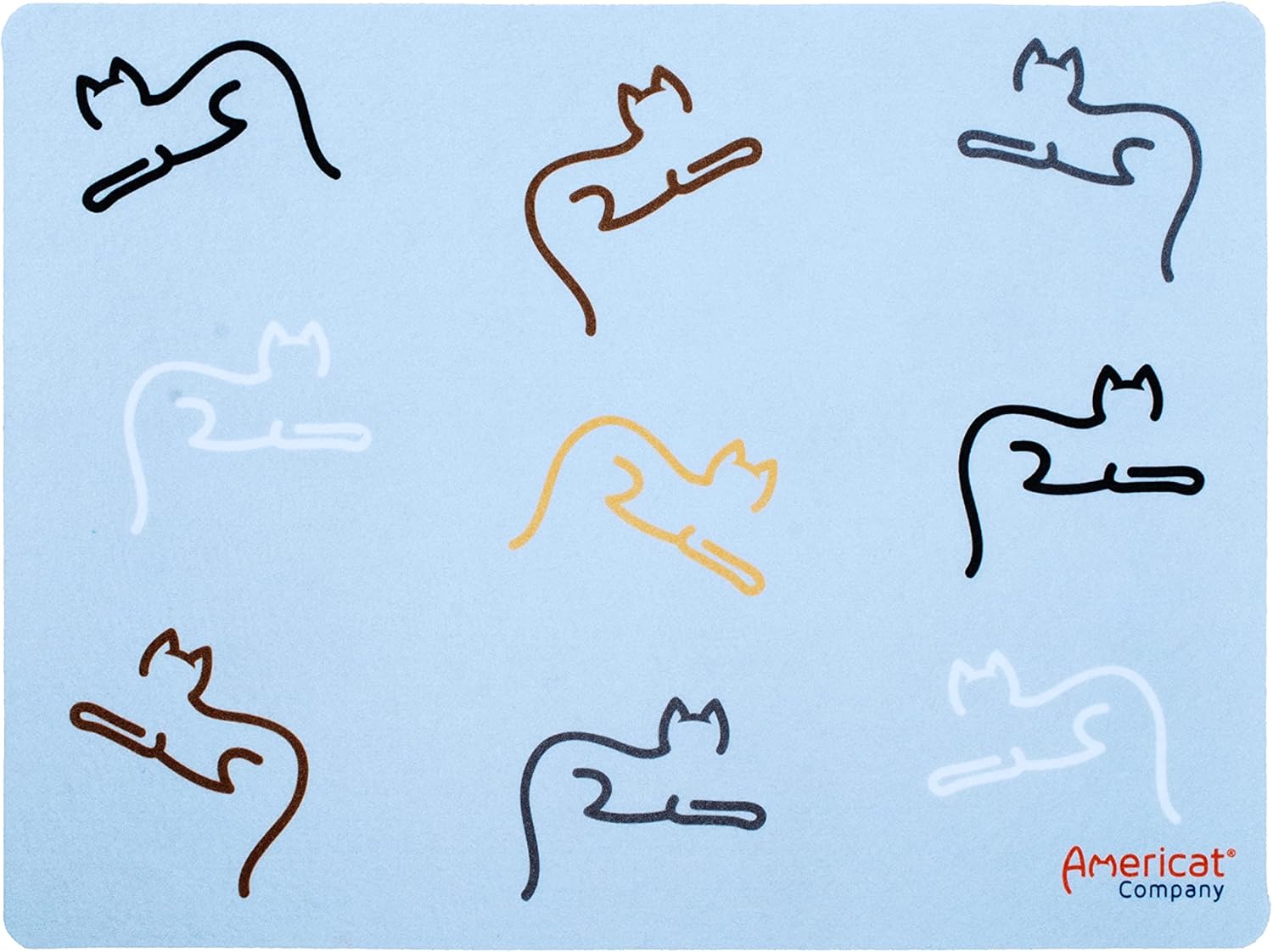• PLACEMAT SIZE: 16 x 12 inches. Space for indoor cats and kittens to use a single bowl, multiple bowls, or fountain. Blue gray background with cat design. Pair with Americat Company bowls and raised stands