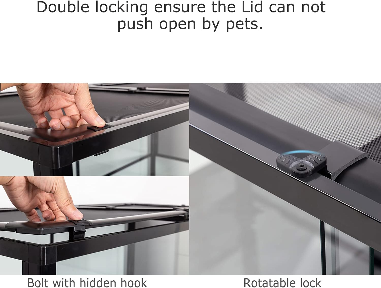 • 【Anti Escape】Security buckle on the lid ensure the tank closed tightly, prevent your reptile amphibian chameleon pets from escaping. And the security lock avoid the doors open accidently by your kids and keep your kids safe.