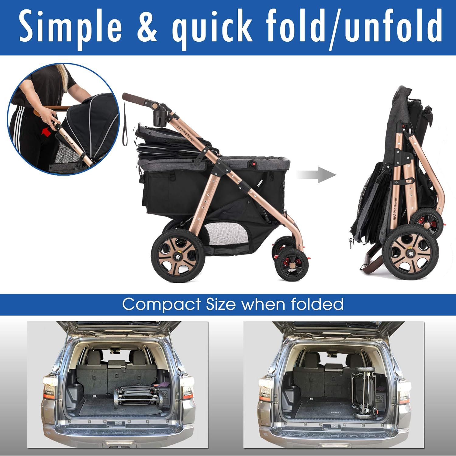 • MULTI-PET DESIGNS ★ Super spacious pet compartment, four interior tethers and front/rear entries can comfortably accommodate one to several pets up to 100Lbs. Accessory hooks allow additional pets to travel alongside this pet stroller SUV. Three organizer pockets, cup holder and large under-basket made traveling easy and tidy.