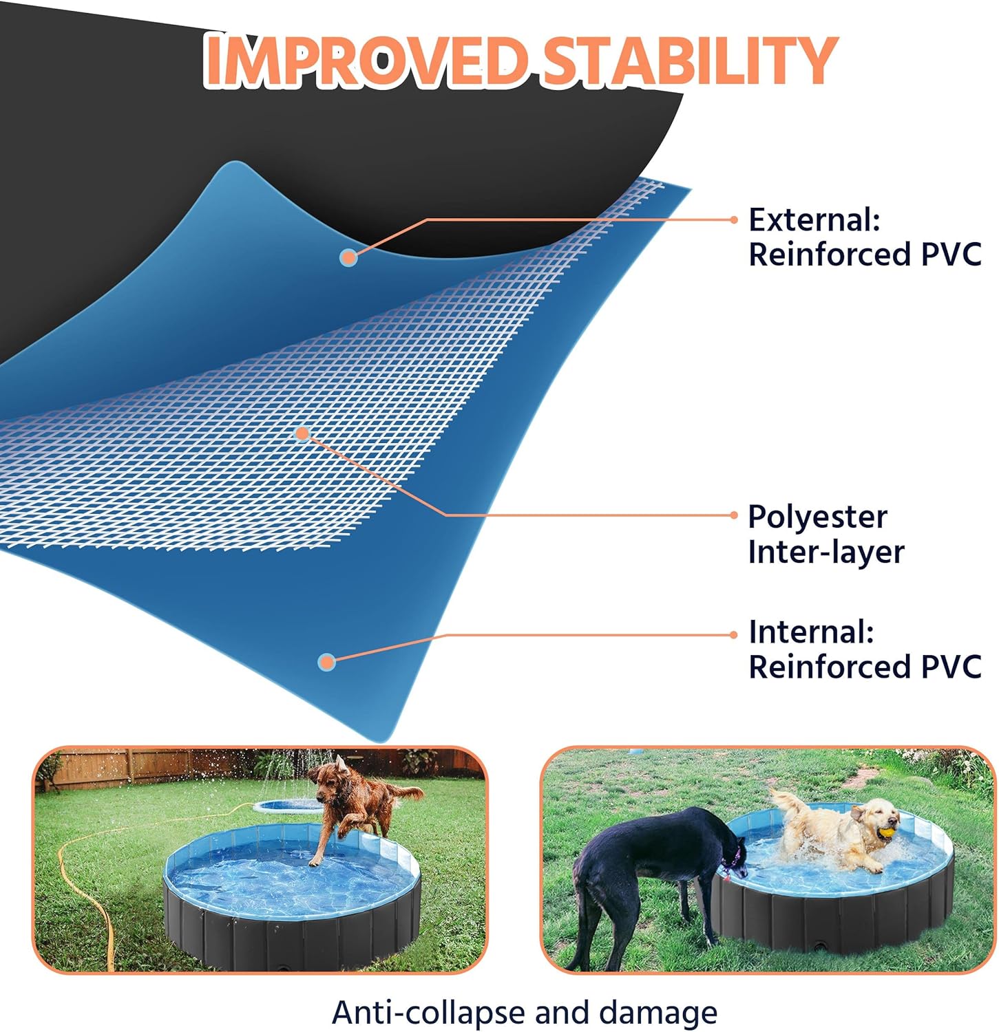 • Premium Materials: The pet pool is made of waterproof PVC and polyester mesh in the interlayer, and the interior material is made of durable PP boards. The quality materials are strong and durable, and wear-resistant for long-time use