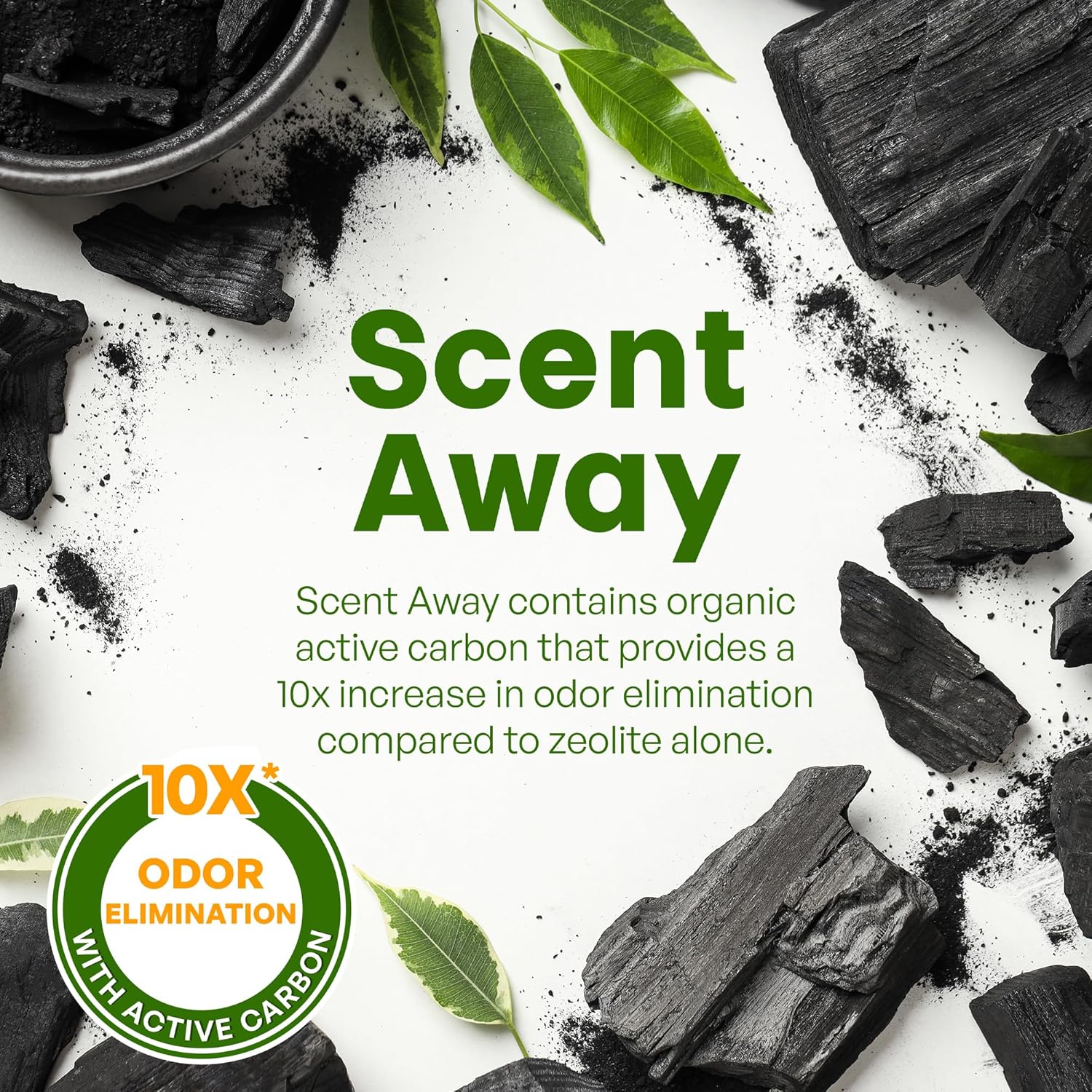 • EXTENDS CAT LITTER LIFE - Not only does Scent Away cat litter deodorizer remove odors from cat litter, it improves moisture holding capacity and extends cat litter life naturally with its active carbon ingredient. It also helps the environment, removing harmful greenhouse gasses from the atmosphere.