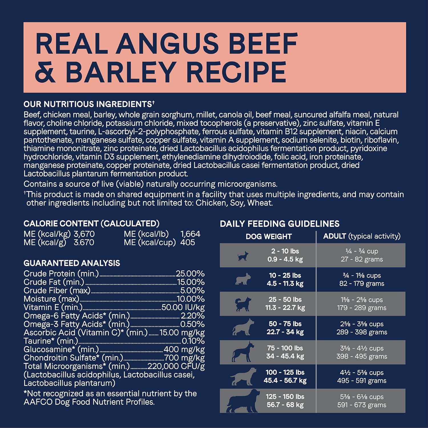 • Real food ingredients for the taste your dog will love. Crafted with real angus beef as the first ingredient, paired with wholesome grains like barley, sorghum and millet