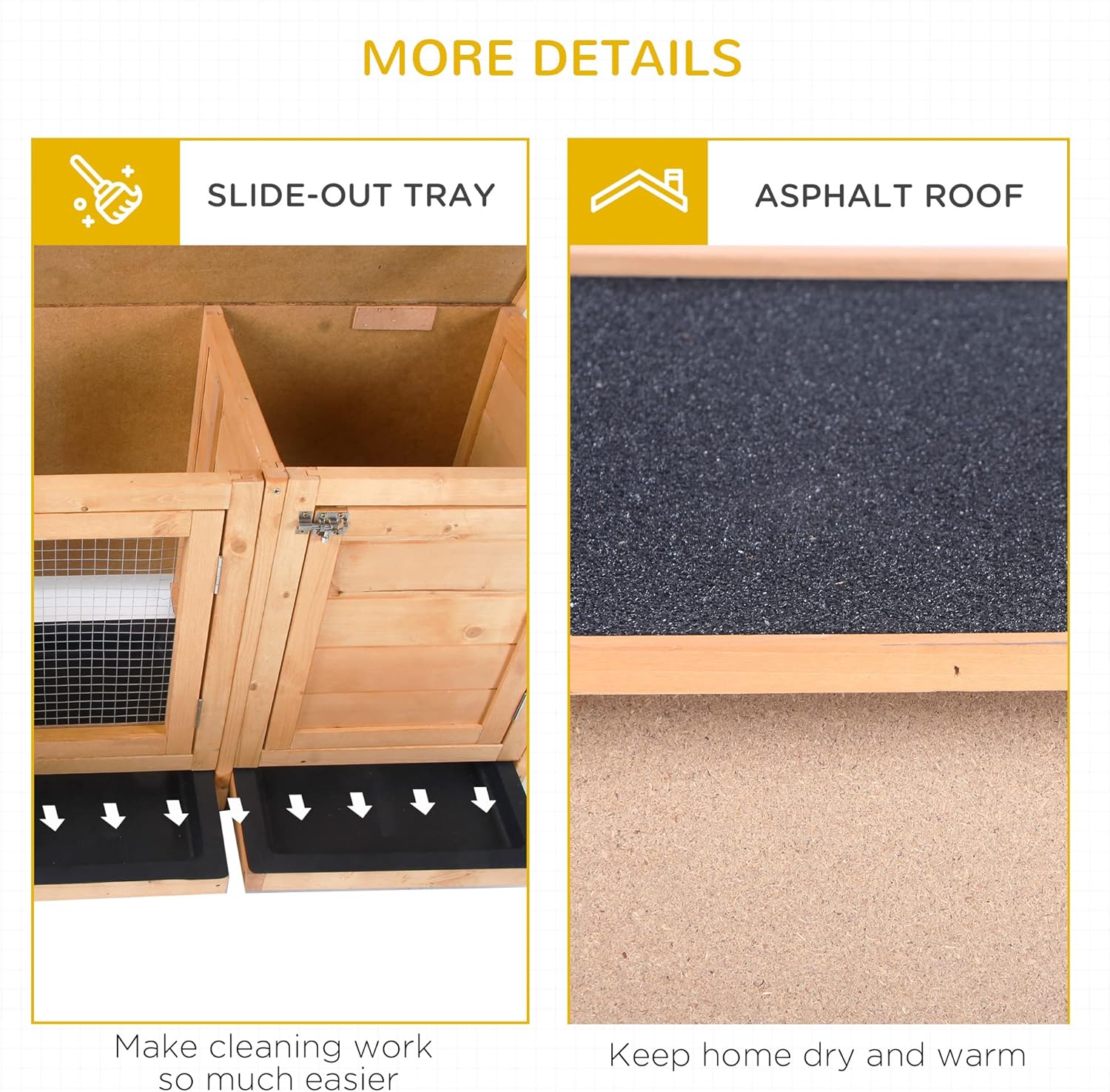 • Keep Your Pets Dry: This bunny house is made with fir wood with a composite asphalt roof to provide a stable structure and to keep your pets out of the rain.