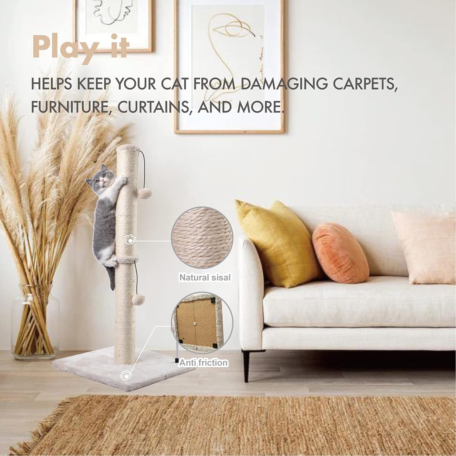 • Protect your furniture: - Grab sticks and plush toys combine to attract cats to play and grab, natural sisal is suitable for cats to grab, effectively preventing cats from grabbing furniture .