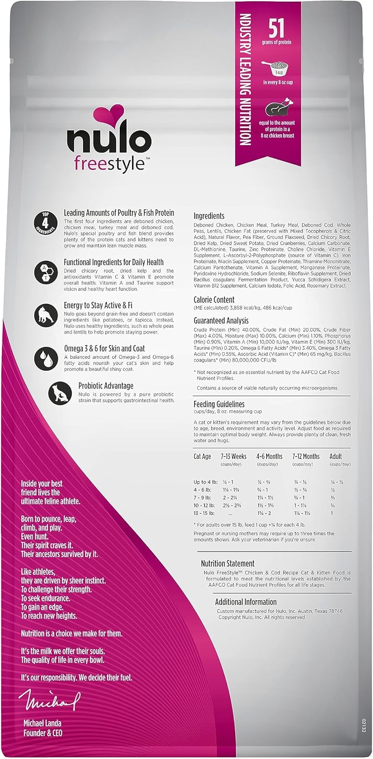 Nulo Freestyle High Protein Cat & Kitten Food, Chicken & Cod Recipe - Natural Grain-Free Dry Cat Food with Omega Fatty Acids & Probiotics, 2 lb Bag