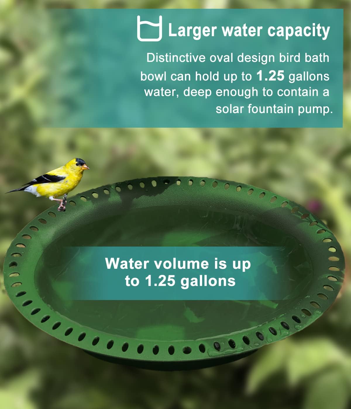 • More capacity & Oblong shape: This extra-large bird bath has an OBLONG tray with small holes along the edges, providing a stable standing and resting environment for the lovely bird friends. Bird friendly color--Green color basin is gentle and unobtrusive in your outside areas, and deep enough for contain a solar fountain pump. (Bowl dimension: 17.2” L × 13.2” W, bowl depth: 2.76 inches.)