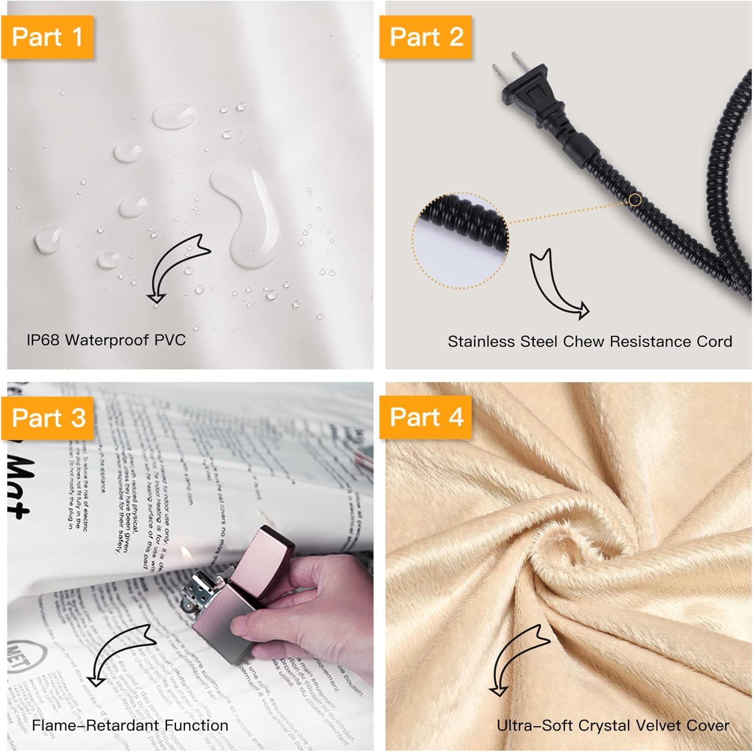 • ❤【Safety and Secure Structure】7-layer protective structure with UL-certified heating wire protect pets from burns. Soft PVC envelope with waterproof and flame-retardant function. Built-in intelligent temperature sensor in the heating pad to prevent overheating to protect pets. Don’t let your pets lay on the pet heating pad without a plush cover.