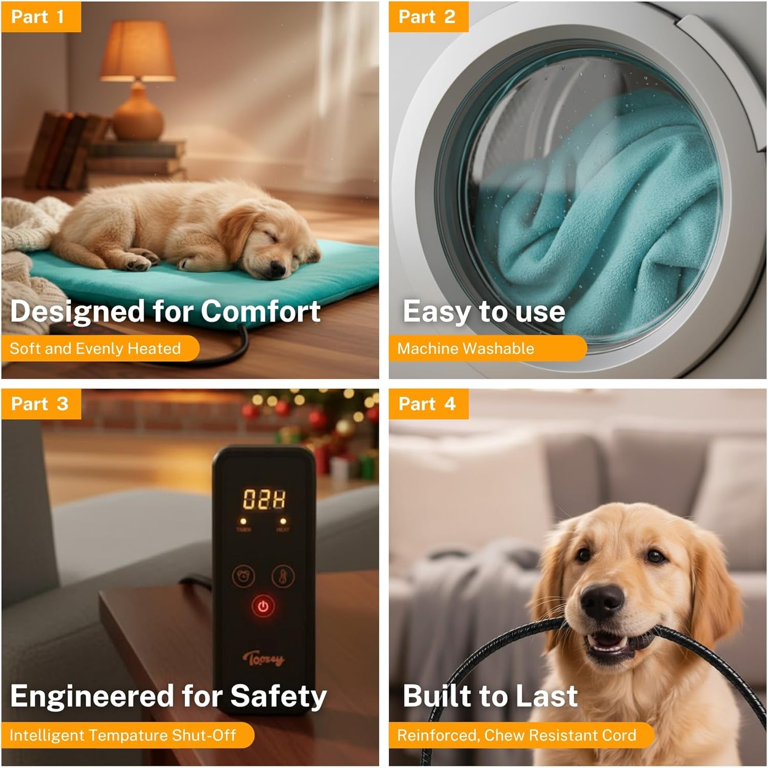 Toozey Pet Heating Pad, 6 Adjustable Temperature Dog Cat Heating Pad with Timer, Waterproof Heated Cat Bed with Chew Resistant Cord, Indoor Electric Pet Heated Mat 18x16in