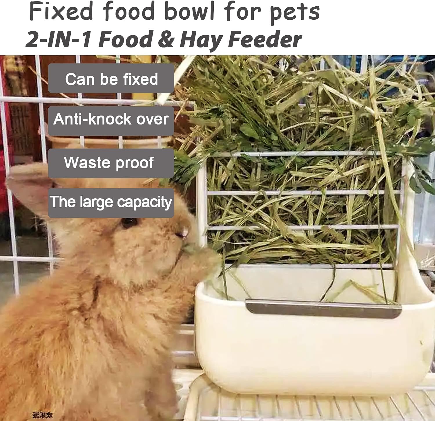 • 【2-IN-1 Food & Hay Feeder】This is a feeder designed for small animals like Guinea Pig, Rabbit, etc.The feeder’s upper layer is a grass rack,and the lower layer is a food bowl. Reduces the forage waste caused by pets feeding and keep the cage in order. White fence in middle separate the forage and grain, which will not cause them to mix. Pets can easily pull hay over the fence while feeding, but it doesn't mess up the cage.