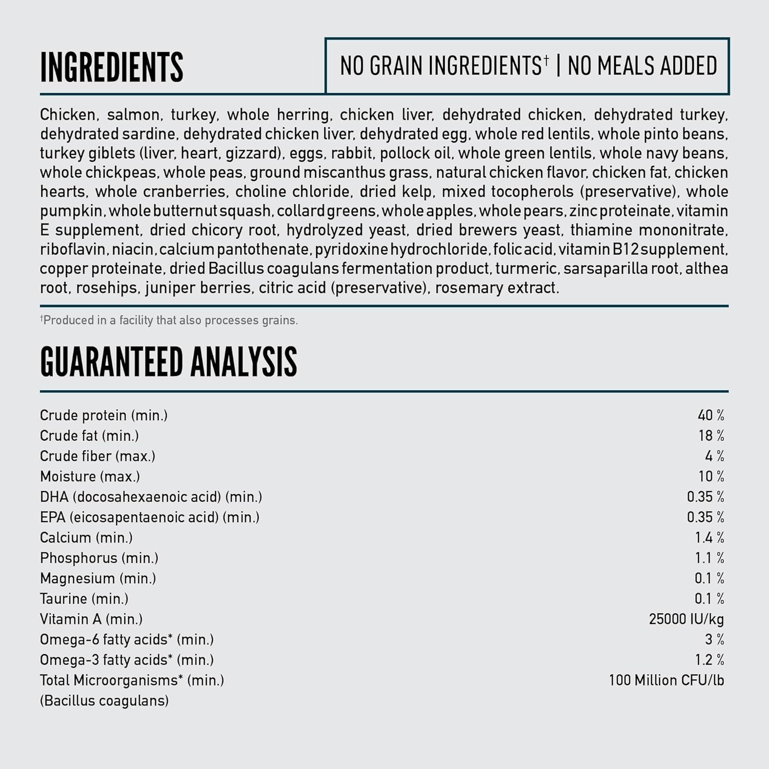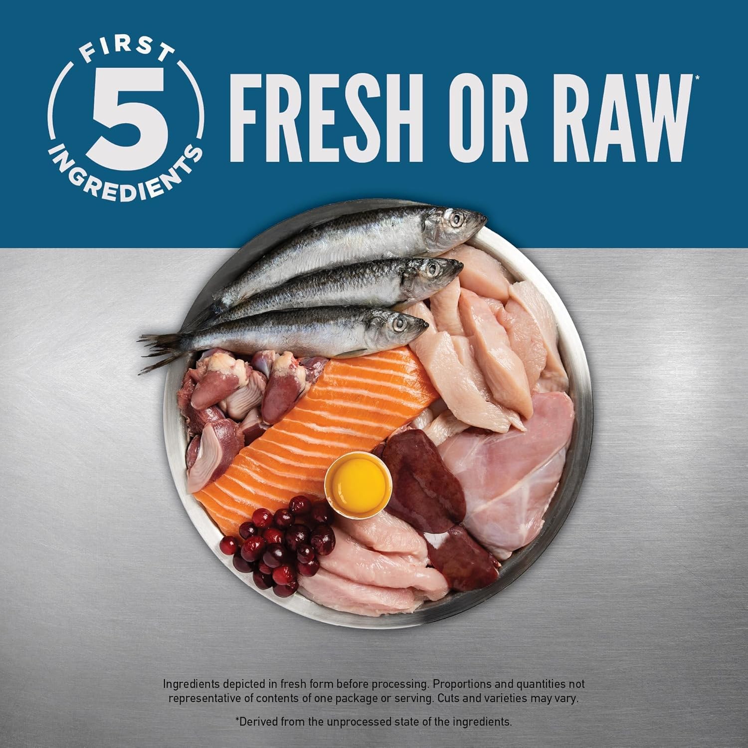 • First five ingredients are fresh or raw*, including chicken, wild-caught salmon and rabbit, and responsibly farmed pollock oil offers increased levels of Omega 3s, EPA and DHA