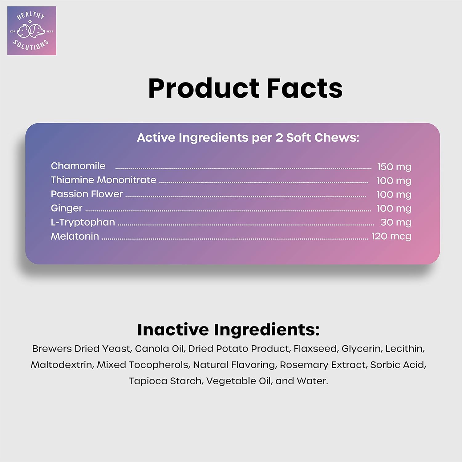 • 🗸 VETERINARIAN FORMULATED -- with Melatonin, Chamomile, Passion Flower, Thiamine, L-Tryptophan, and Ginger to help soothe sensitive stomaches.