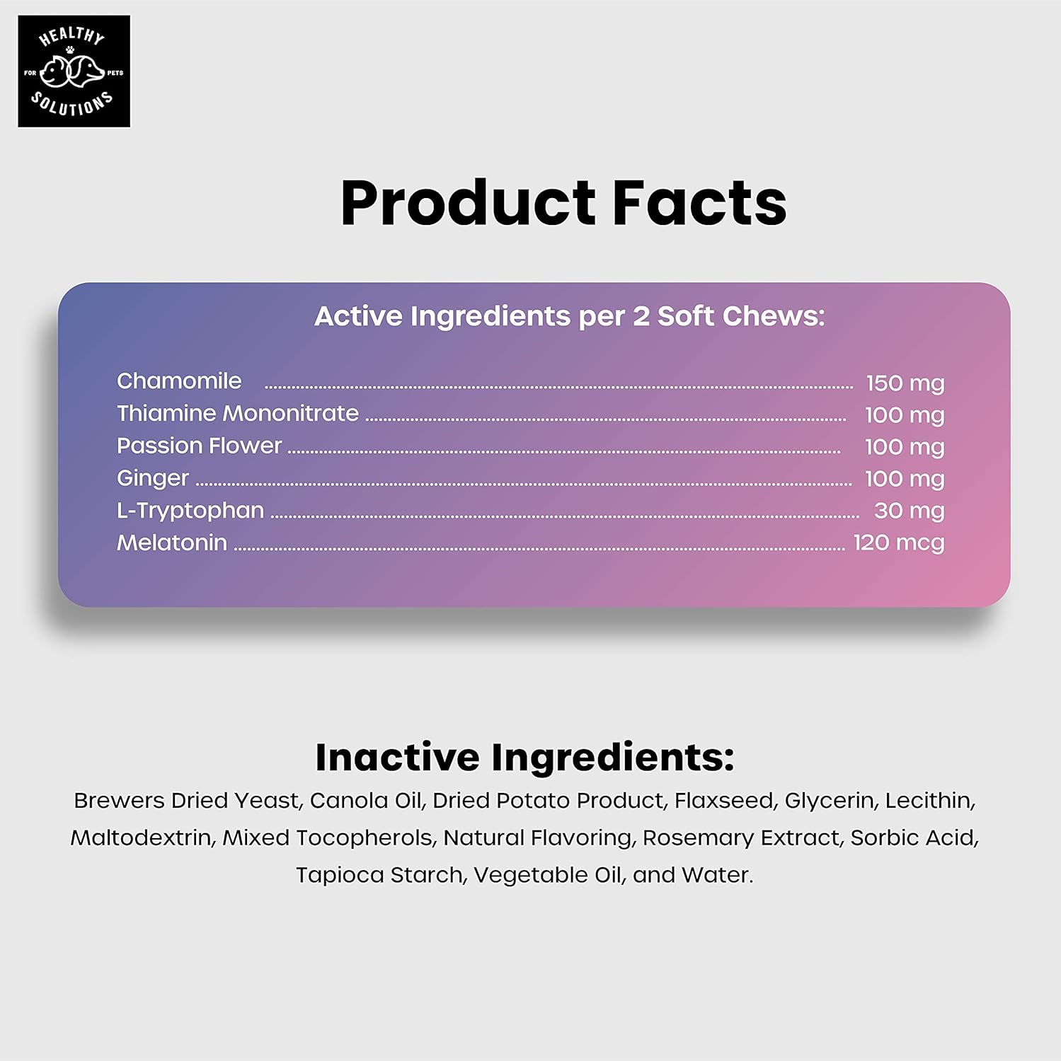 • 🗸 VETERINARIAN FORMULATED -- with Melatonin, Chamomile, Passion Flower, Thiamine, L-Tryptophan, and Ginger to help soothe sensitive stomaches.