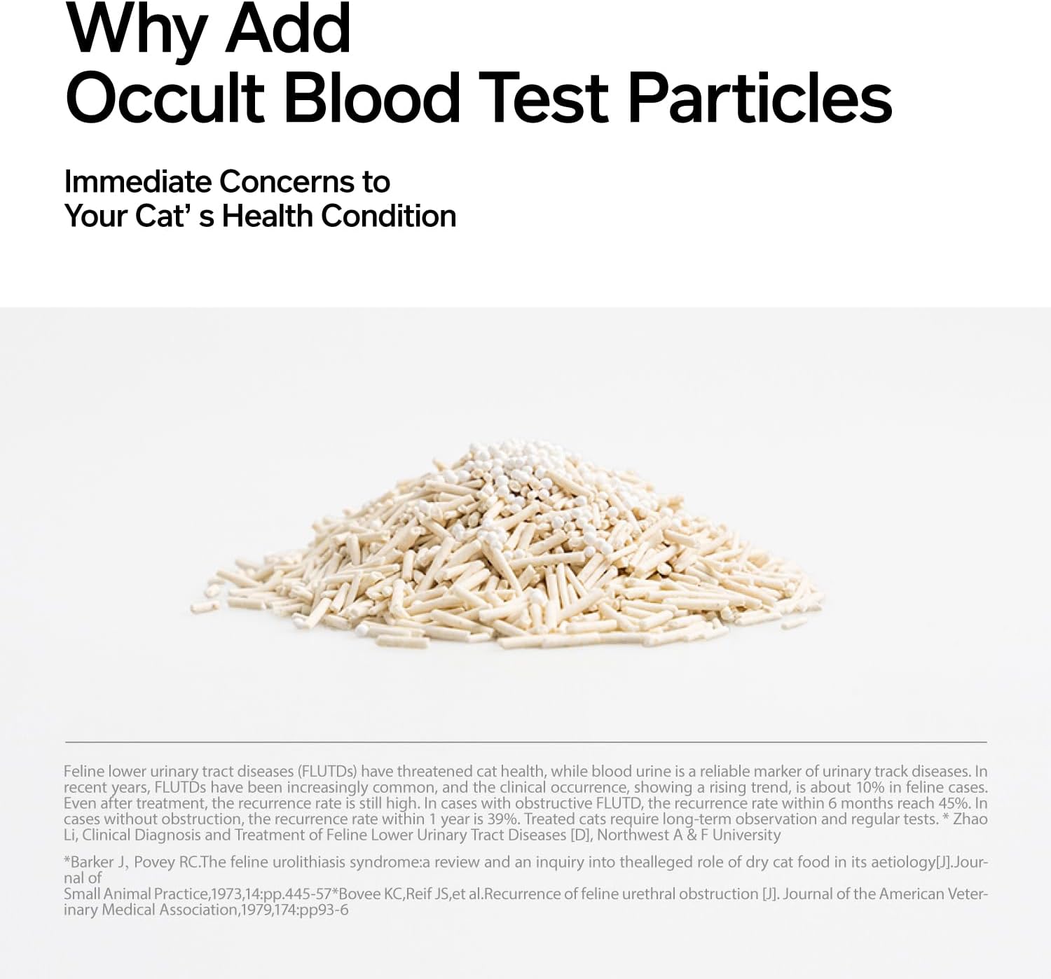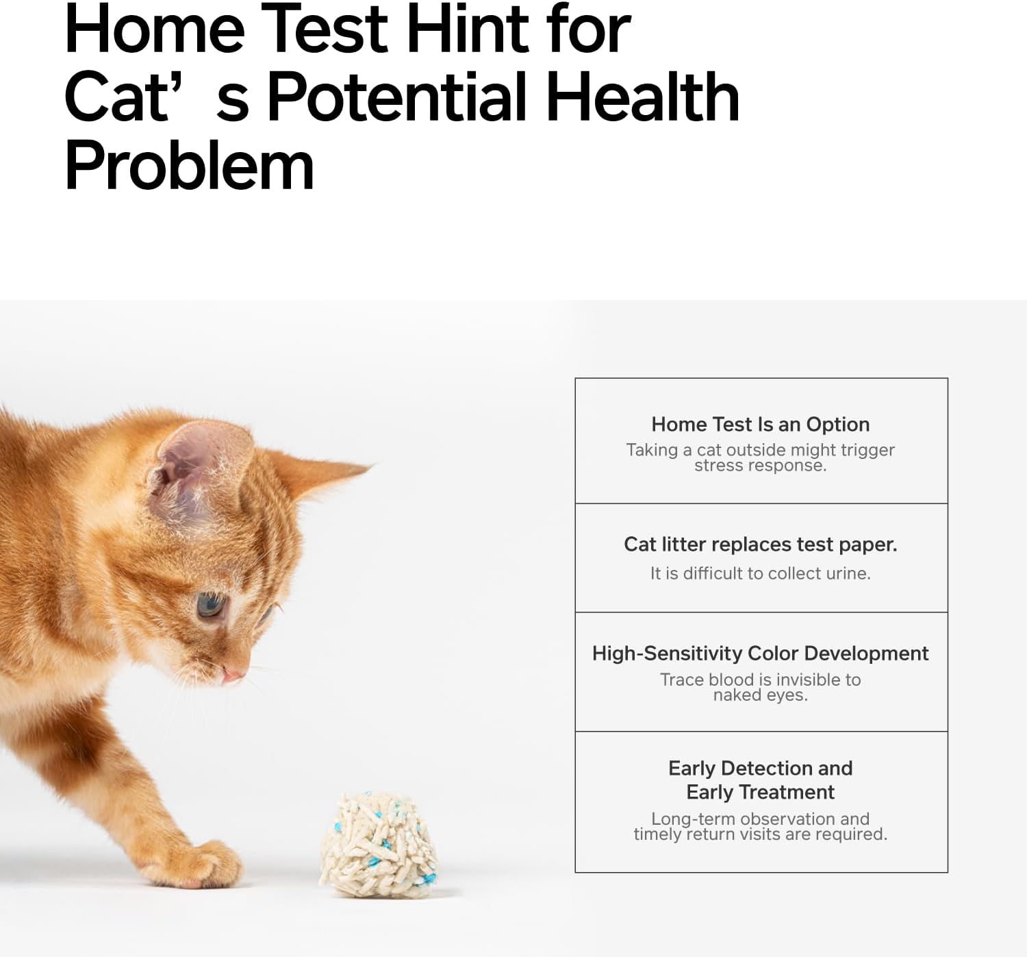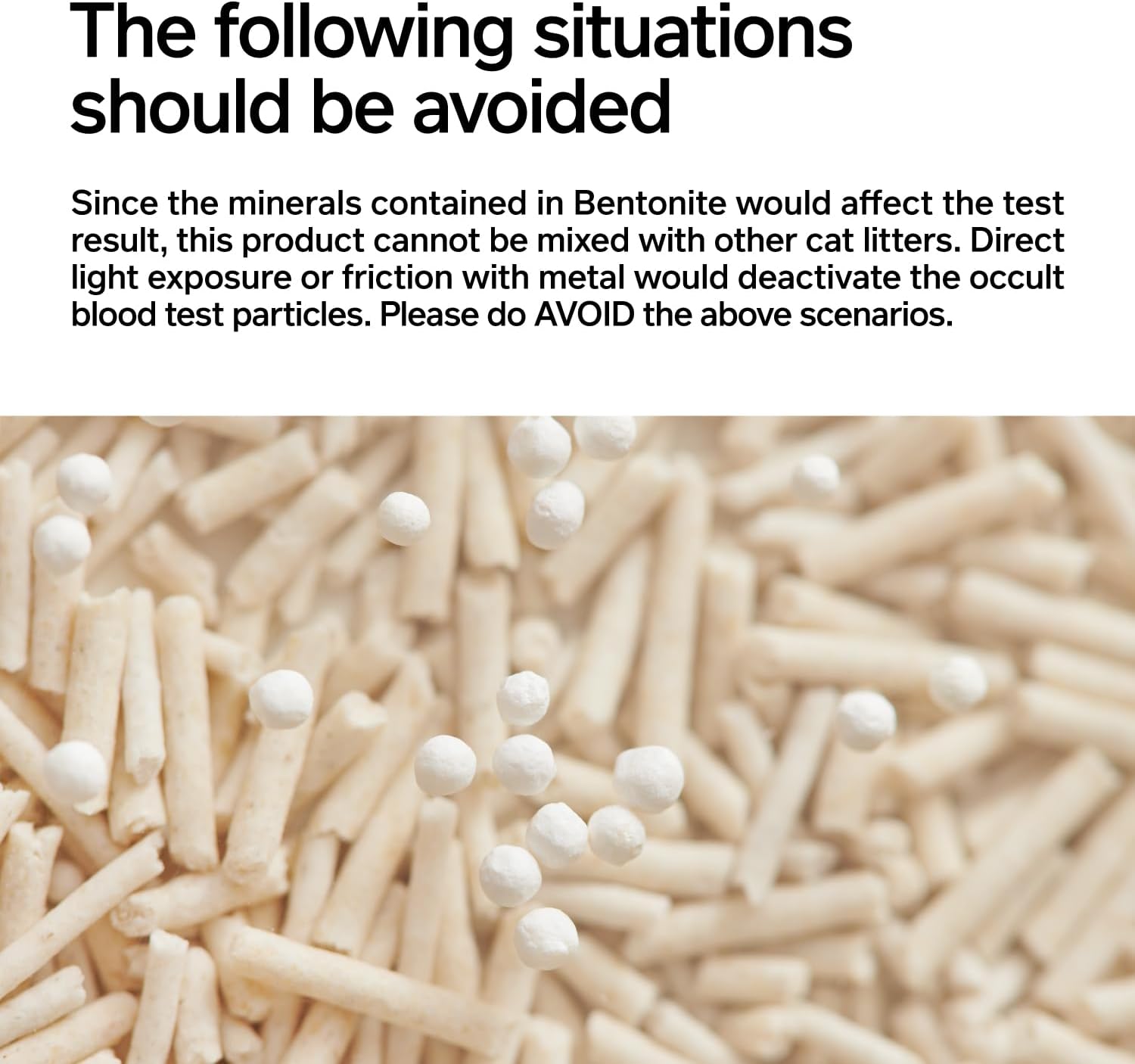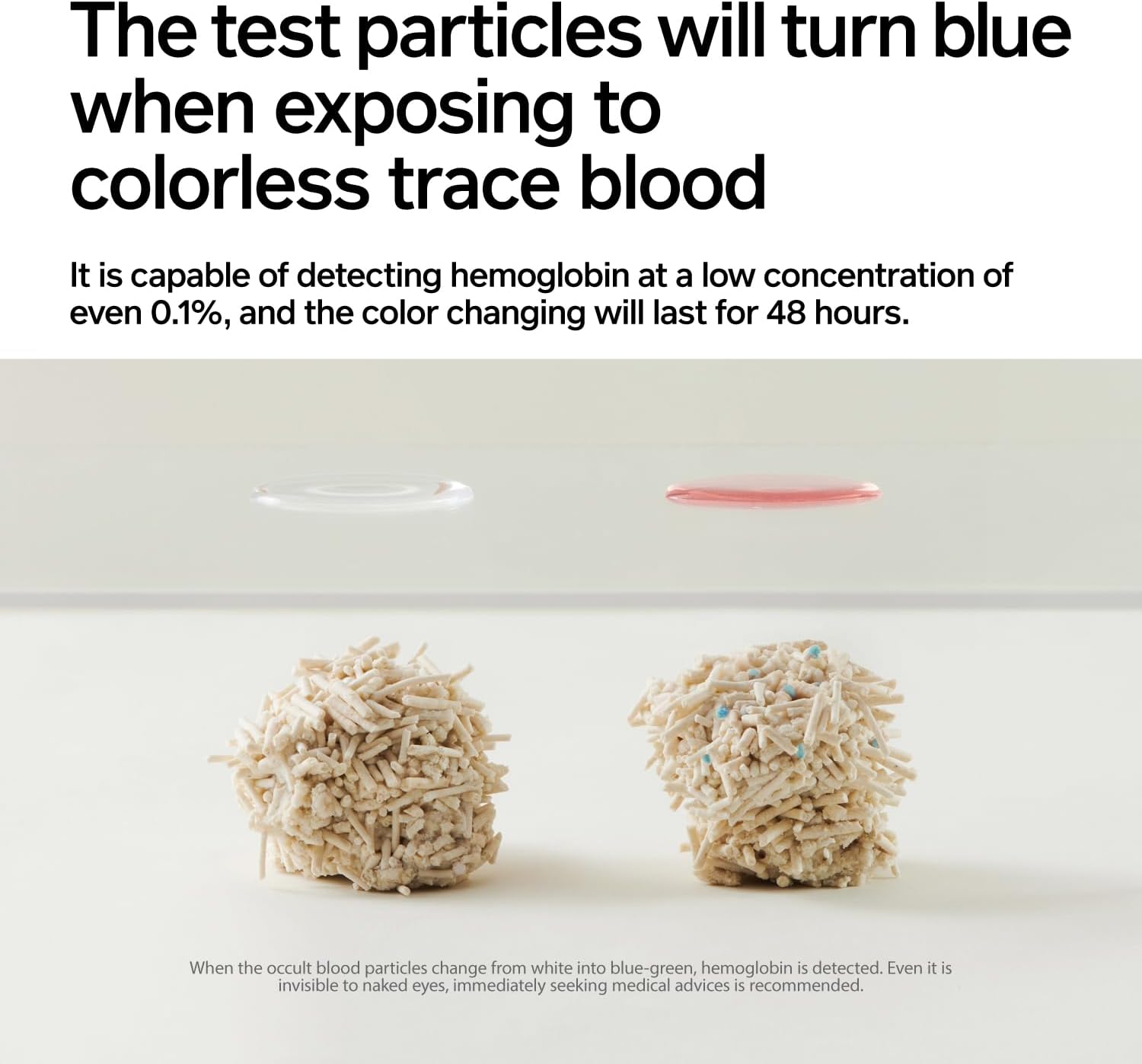 • 【Attention】 1.Direct exposure to hard light or friction with metal would invalid the detection function of the occult blood test particles. Please avoid such situations.2.Mineral substance contained in bentonite would affect the detection performance. Do NOT mix the product with other cat litter. 3.The vacuum design is only to facilitate its transportation and storage, and air leakage does NOT compromise the use. If you DO mind, please contact us.