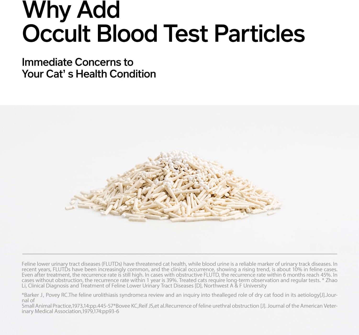 • 【Attention】 1.Direct exposure to hard light or friction with metal would invalid the detection function of the occult blood test particles. Please avoid such situations.2.Mineral substance contained in bentonite would affect the detection performance. Do NOT mix the product with other cat litter. 3.The vacuum design is only to facilitate its transportation and storage, and air leakage does NOT compromise the use. If you DO mind, please contact us.