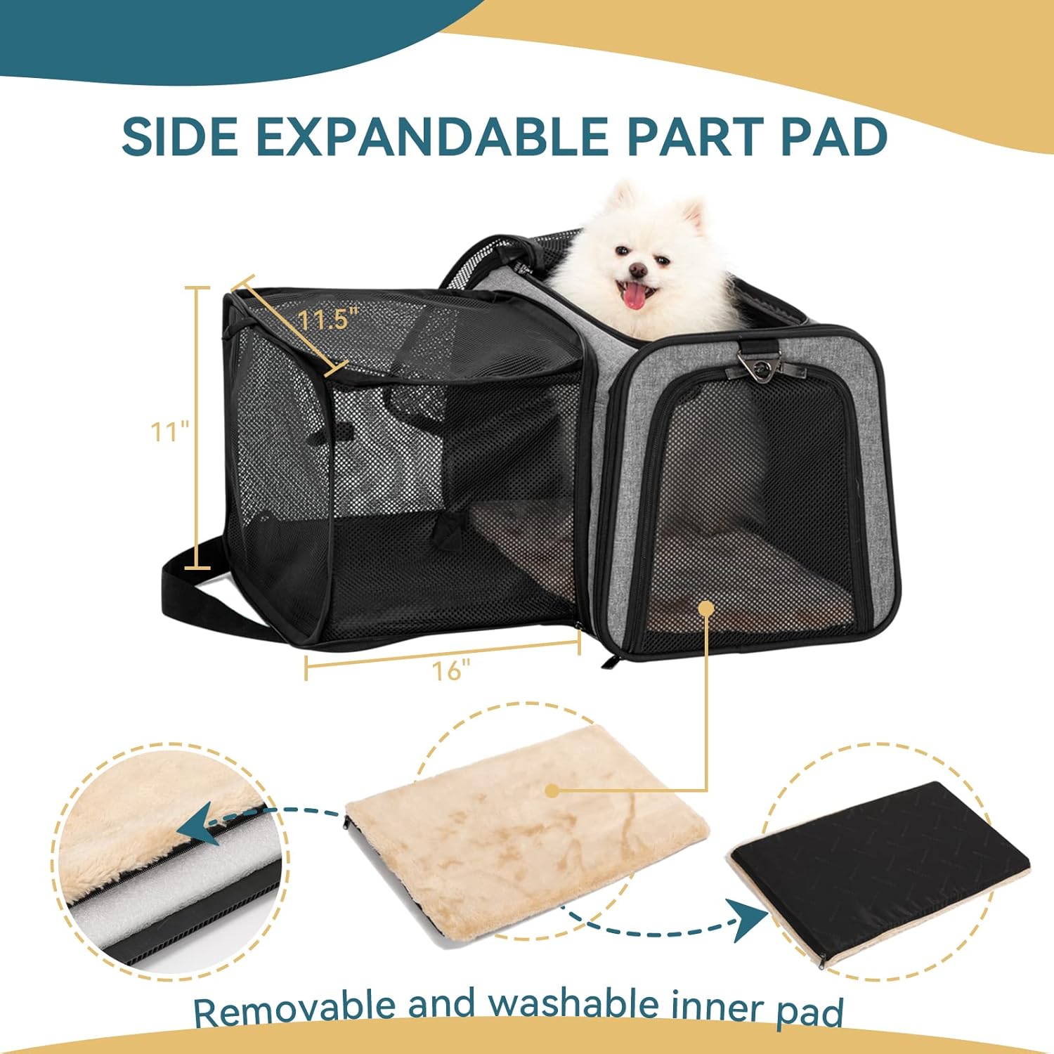 • Durable Material: The dog travel carrier is made of high-quality oxford fabric and scratch-resistant mesh; the interior fabric is splash-proof and easy to clean. Square side expansion adds more space for your pet than fan-shaped expansions. The top sides have built-in sturdy fiber poles to increase the stability of the carrier, and the poles can be removed when necessary.