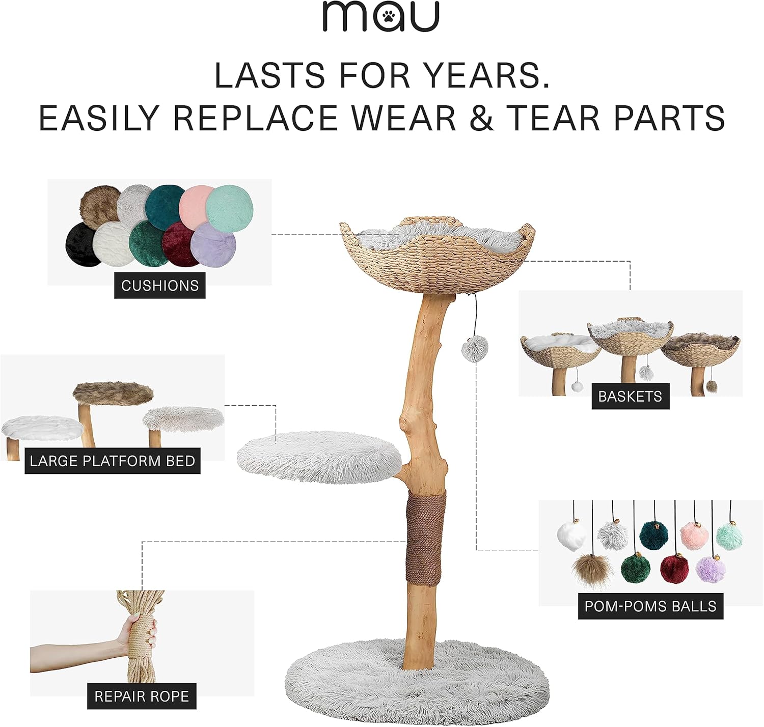 - MADE TO LAST & ENDLESS SUPPORT: These trees are extremely high quality and made to last for years to come. You’ll always be able to keep your cat tree looking new because replacement parts can be purchased for ANY part on the tree. If you ever have any sort of issues with your tree, our team of cat lovers are ready to assist you. Your satisfaction is extremely important and we are here to make sure that you and your kitty have the best experience possible with Mau!