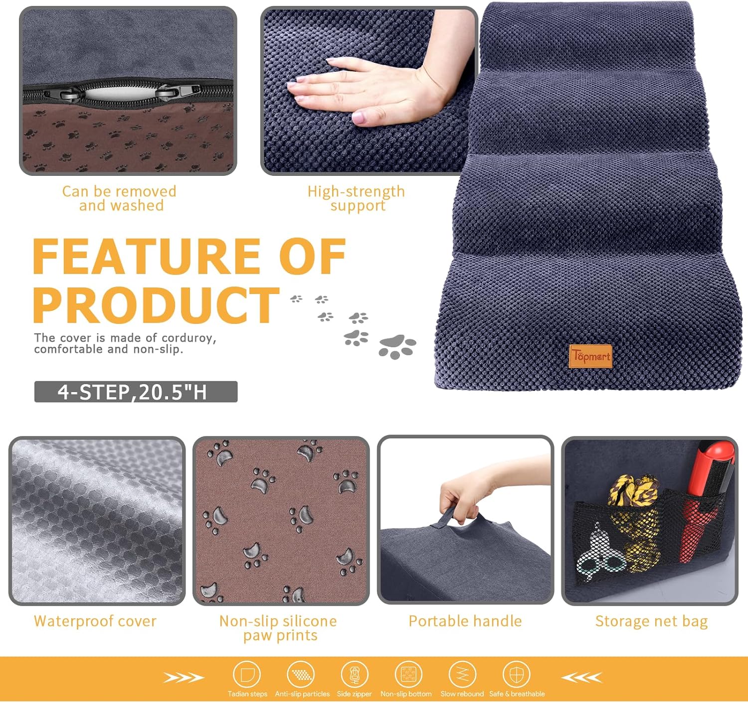 • Safer,Wider&Deeper Steps:Each step is 15.75in x 7.1in.Our dog stairs are excellent for those older dogs who are less mobile as they age or for cats with injuries. More wide and deep steps are helpful for reducing the strain that constantly jumping up and down onto bed,sofa or car can have on your pet's joints,and topmart dog steps will not shake and slip during use. The cover made of corduroy is more frictional than other covers, pets will not slip on the stairs.