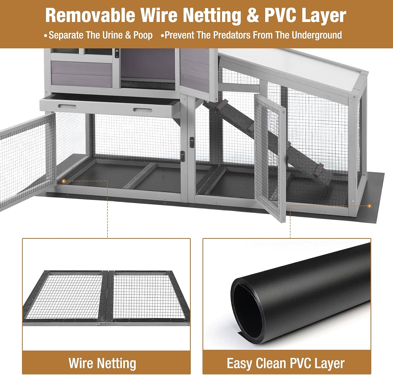 • PVC Layer: The PVC layer prevents urine from leaking out of the floor. Easy for you to clean the bunny hutch, and prevents predators from the ground