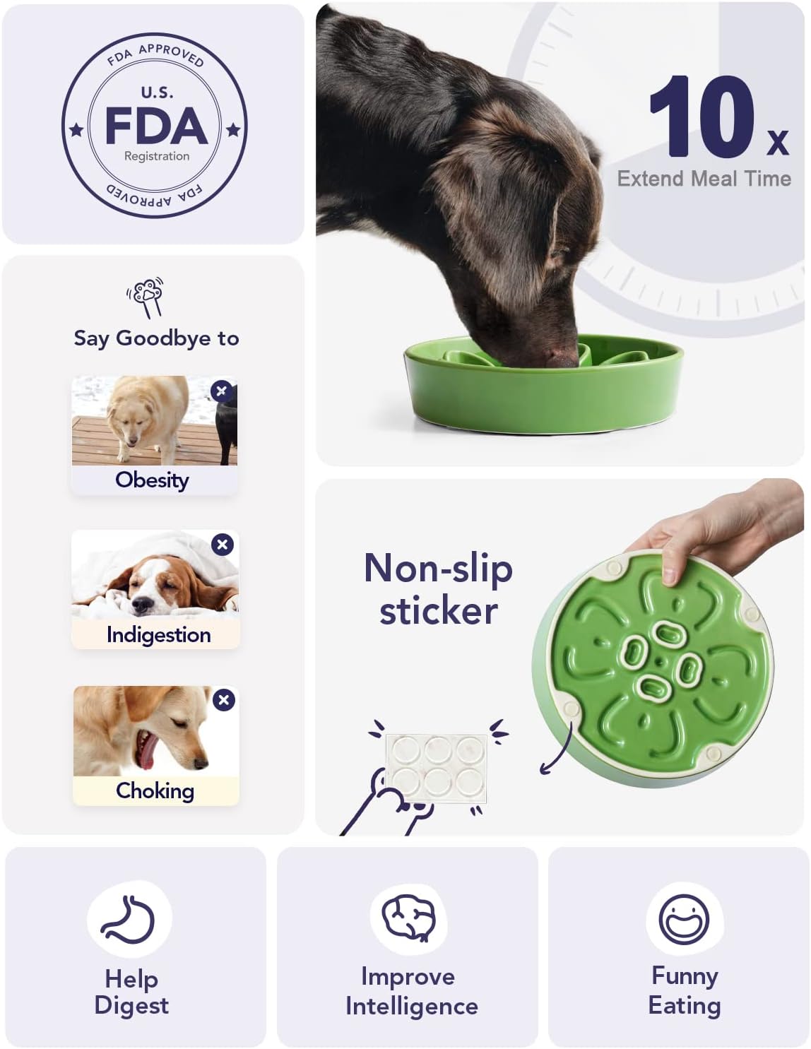 • Slow Down Eating, Bring Dog A Healthy Diet: Fast-eating dogs experience bloat, regurgitation, and obesity easily. Our slow feeder dog bowl design with the ridges and maze pattern helps your dog to eat slower than 10 times. Your dog could change his overeating behavior through a challenge and fun mealtime