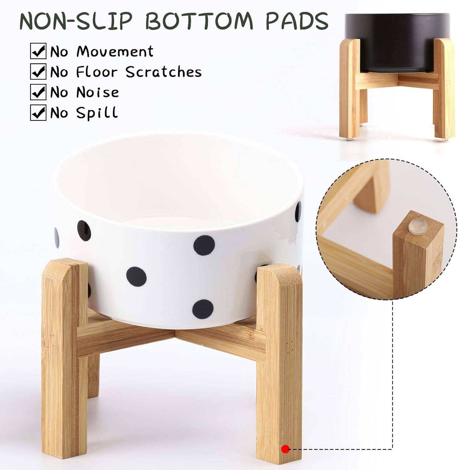 • NON SLIP WOOD STAND -You can get two different heights by flipping the bamboo stand,the elevated cat bowls are perfect for cats and small size dogs from different stages of childhood to adulthood, The wood stand on the bowls stopping ceramic cat dog bowl from sliding around, Keeps pet food and water in the bowls.