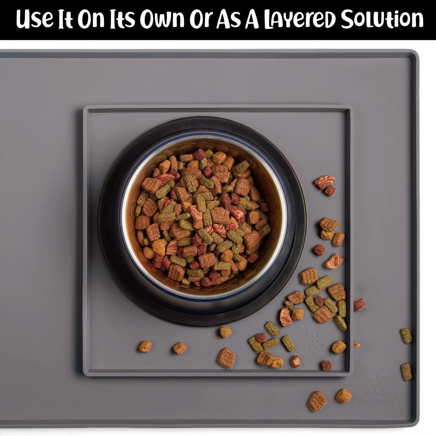 DogBuddy Dog Food Mat – Waterproof Dog Bowl Mat for Food and Water, Silicone Pet Feeding Mats For Floors, Non-Slip Placemat with High Edges For Dogs Bowls, Puppy Essentials (XS: 11" x 11", Shadow