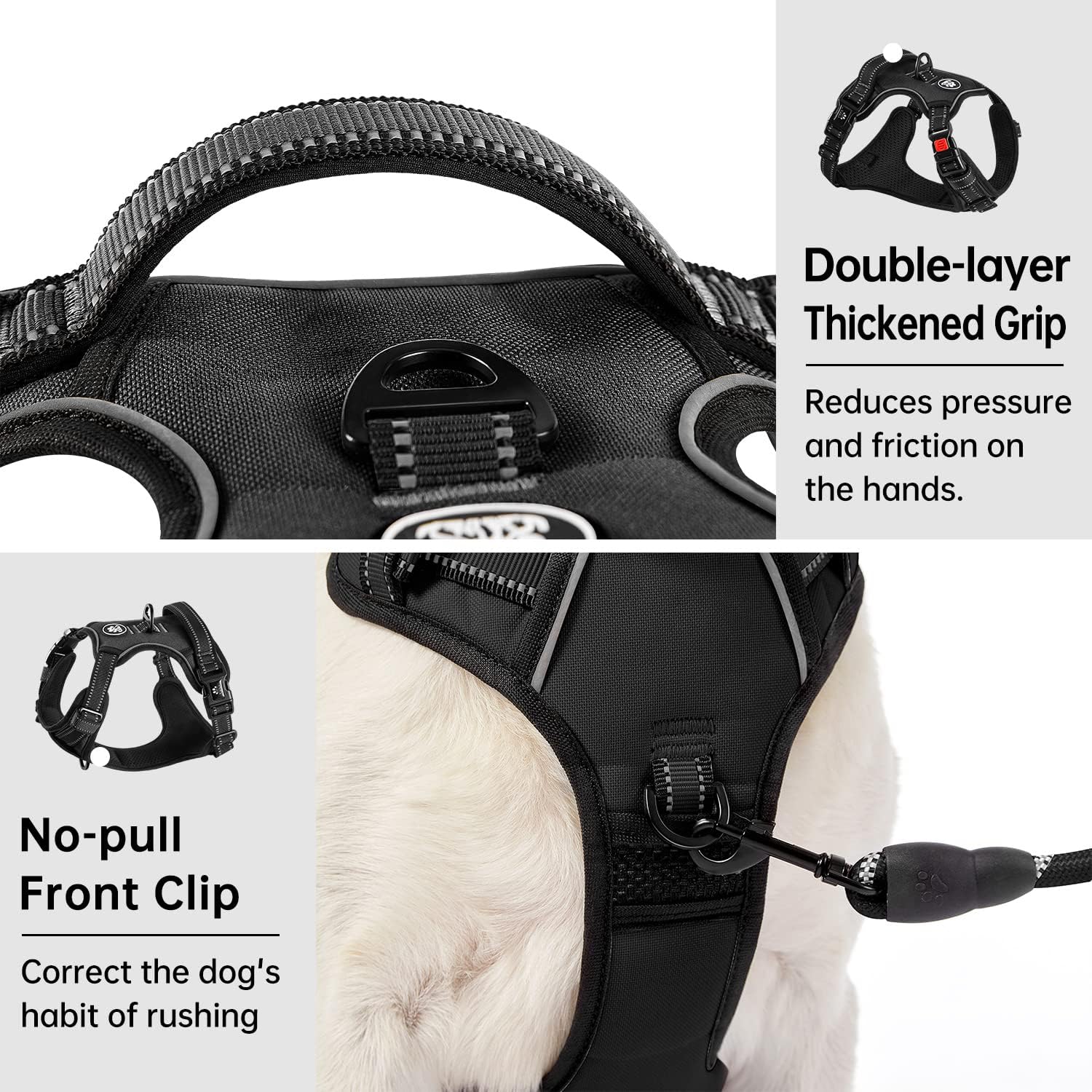 • ≡ NECK WEARING DESIGN ≡ The large dog harness is equipped with 3 buckles on both neck and body position, so you can easily put it on or take it off from the neck side. No more time and effort to put on the harness from the dog's head, and no more worries about hurting your restless dog during the process