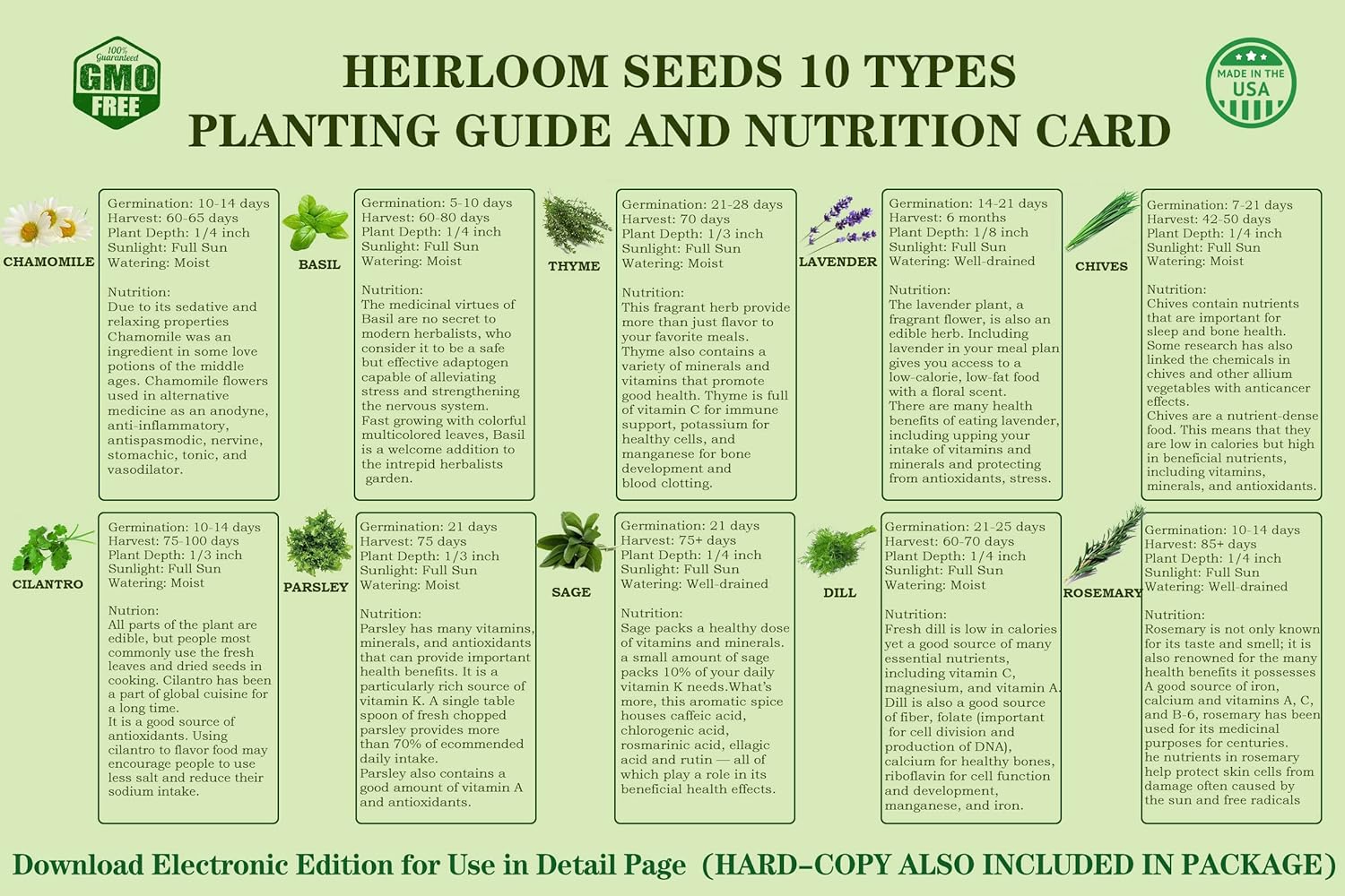 - DIY A SMALL INDOOR HERB GARDEN: We provides seeds that grow into Chamomile, Basil, Parsley, Rosemary, Thyme, Lavender, Chives, Cilantro, Sage, and Dill. All these herbs seeded on your own would be safer and greener to eat, and very suitable to be put on the kitchen's windowsill especially so that you can get and cook with the freshly plucked.