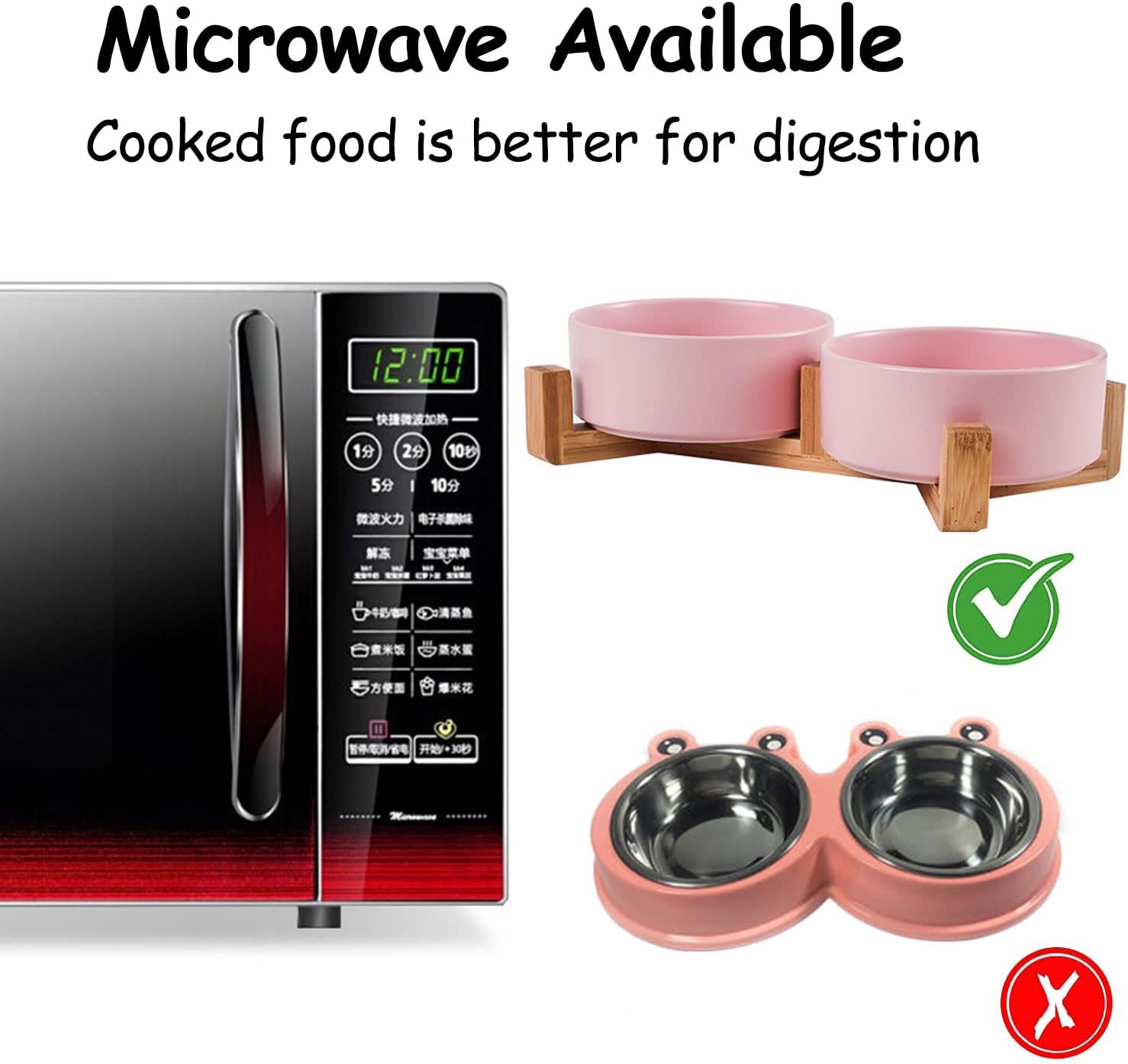 • EASY TO CLEAN CERAMIC - This easy clean dog bowl set is dishwasher proof, as well as easy to handwash and wipe down. With thick walls, these ceramic bowls for pets are sturdy, weighty yet not too heavy. Double Bowl Design:One dog bowl for food and one for water, Each ceramic cat bowl has a Unique wooden stand, raising the dishes closer to your pet for more comfortable eating