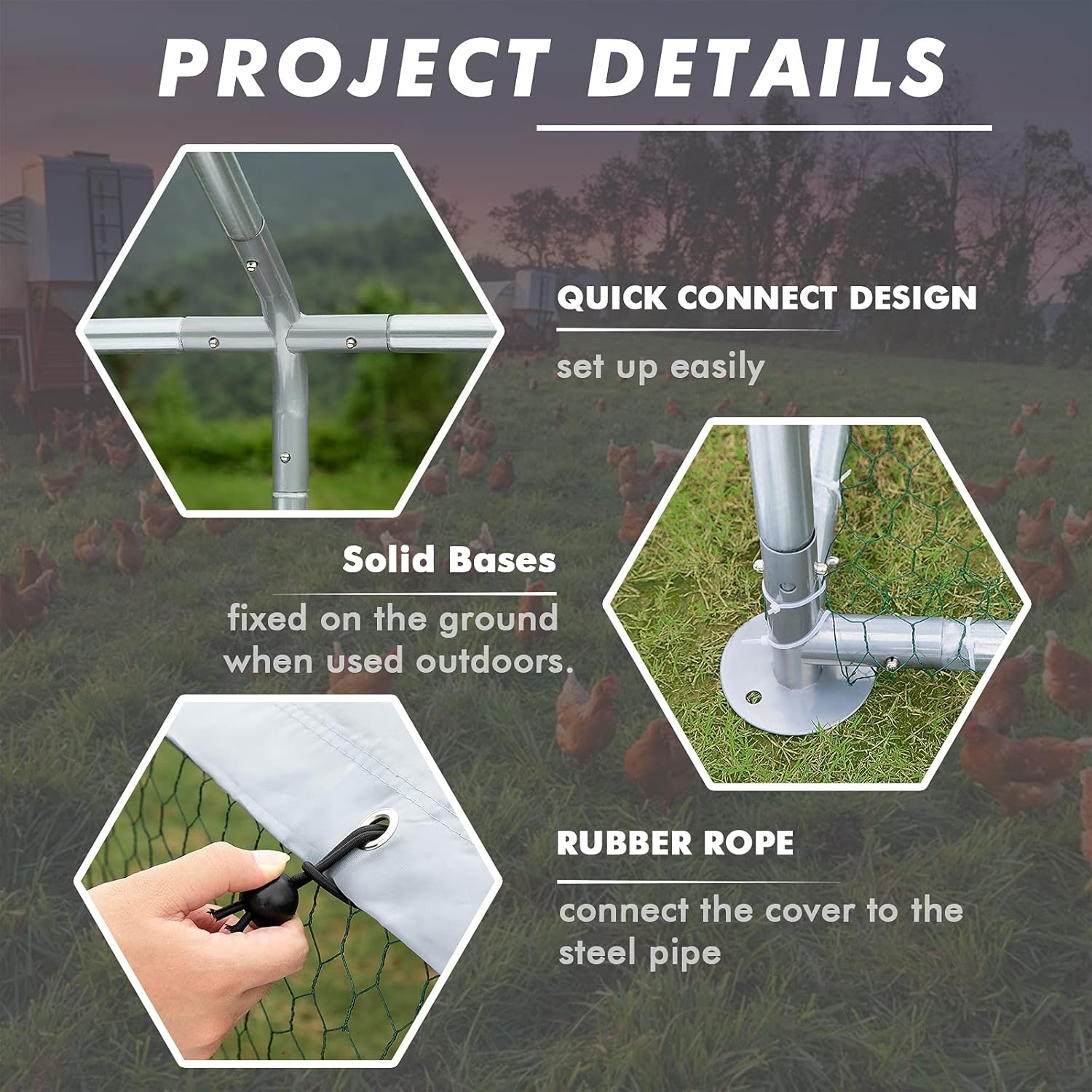 • Durable Steel Chicken run house: The chicken coop uses a durable steel pipe frame, coupled with galvanizing technology, don't worry about rusting in outdoor. The steel pipe diameter reaches 0.98 inches, which is strong and stable enough in windy and heavy rain