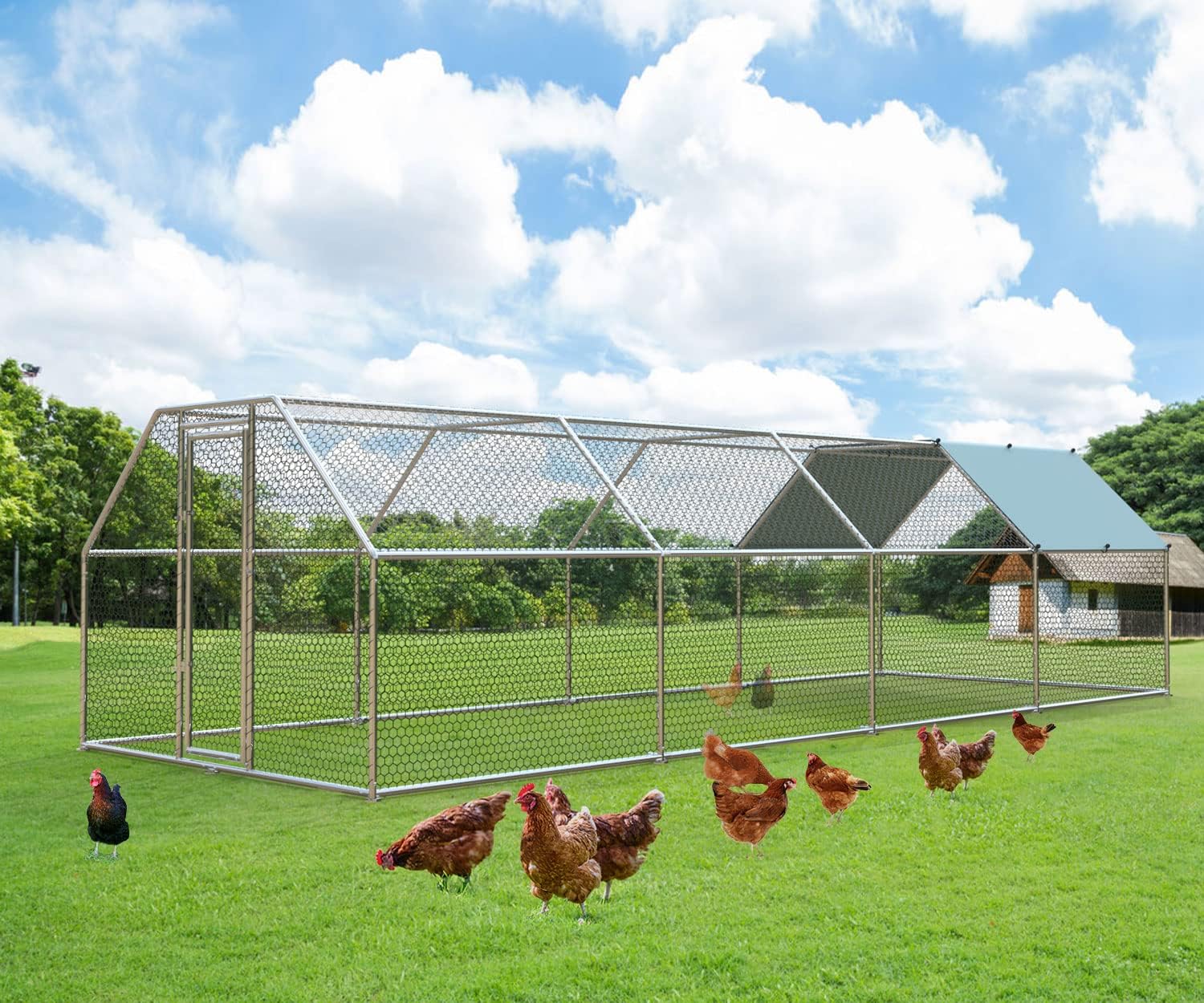 • 【Large Space for 40 Chickens】: The metal chicken coops measures 9.8'L x 25'W x 6.4'H and can accommodate around 40 chickens at a time. 6.4' height provides plenty of space for chickens to move around during the day.