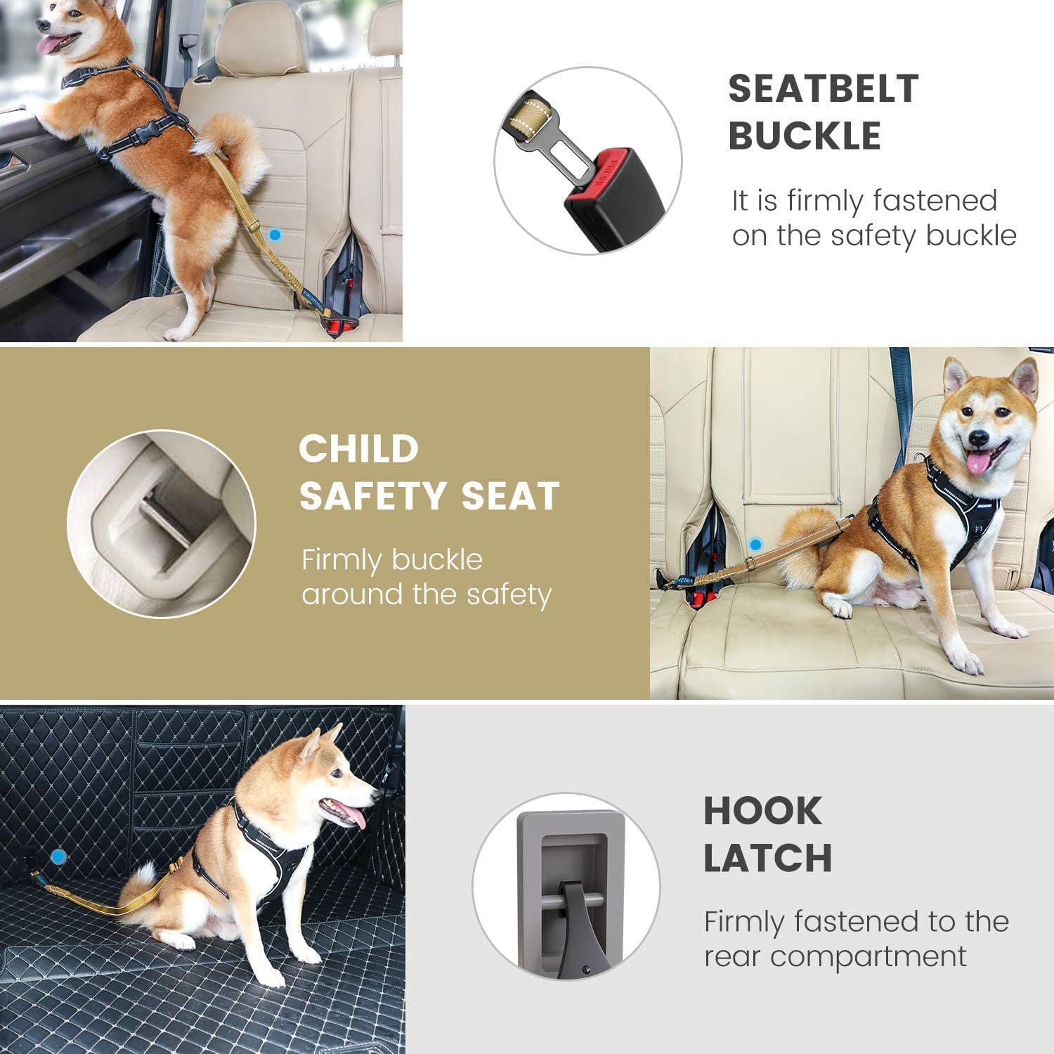 - ◆◇3-in-1 Multi-Function Seatbelt: Our dogs seat belt equipped with 2 different types of car buckles, one of which can be attached to the seatbelt buckle, and the other metal hook latch for connecting the child safety seat and the car trunk, it can be suitable for most of regular and premium vehicles. You can freely choose the connection location as needed.Dog car harness restraints seat belt suitable for front seat,Back seat and Trunk.