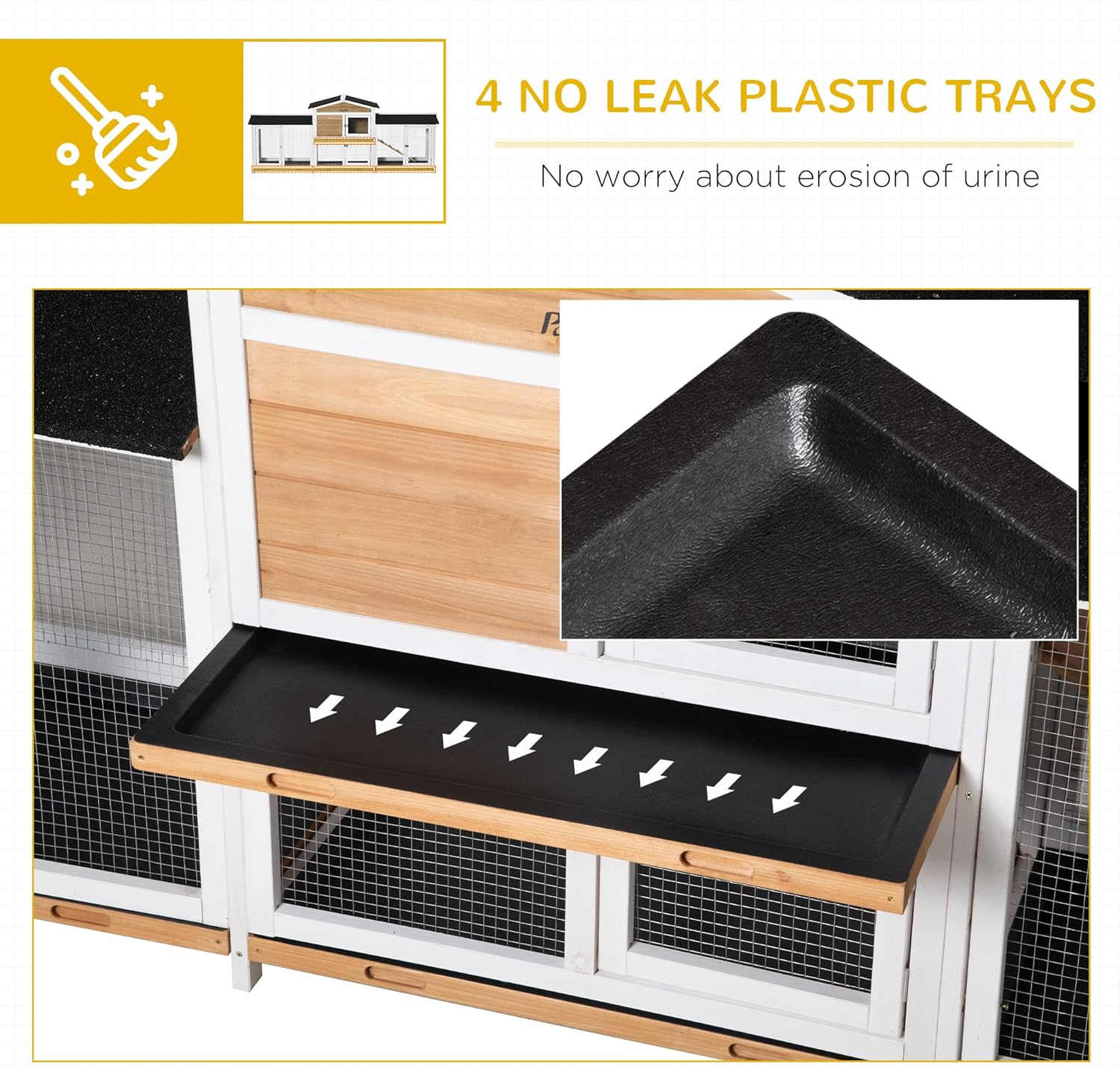 • Easy to Clean: The main house and each run box of this rabbit hutch outdoor have built-in slide-out trays underneath, making cleaning this hutch super-easy.