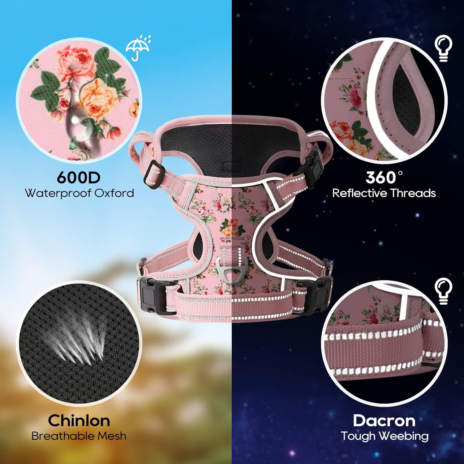 • 【MUCH SAFER & MORE COMFORTABLE】 Breathable mesh lining with soft sponge padding plate of puppy harness prevents injuries, giving extra comfort and protection with enhanced 1600D oxford fabric. The reflective material will be really nice when it gets dark. Also, your dog will be saw easily. This reflective material can make drivers have long time to react, which ensure your dog’s safety!