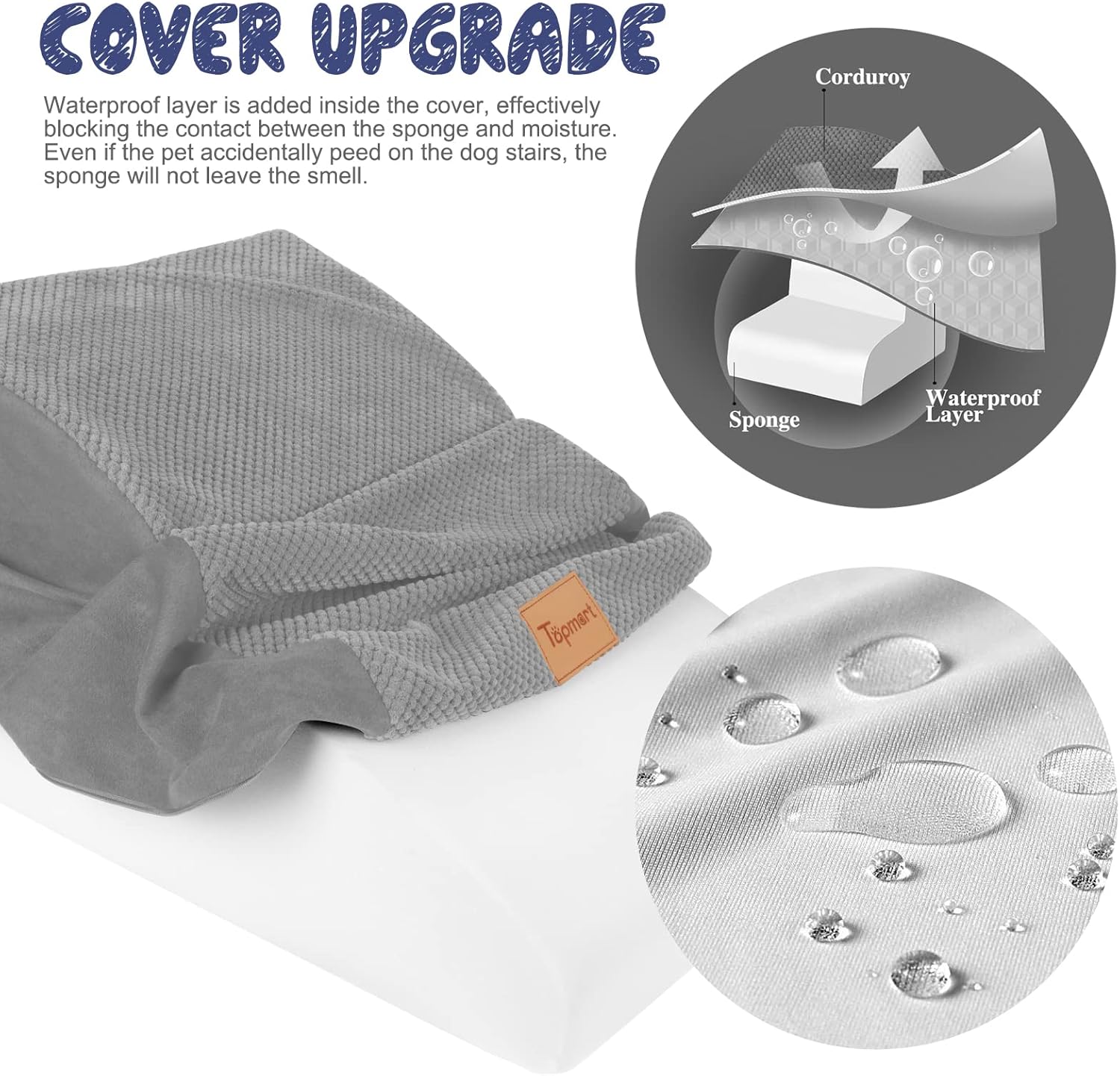 • Upgrade: Compared to the original model, we lengthened each step by 2 inches and each step is larger, increasing the safety of the product while providing a smoother climbing environment for older or leg-injured pets. Cover added waterproof layer to protect the sponge from getting dirty. Even if the pet accidentally pee on the dog ladder, will not leave a mark on the sponge.