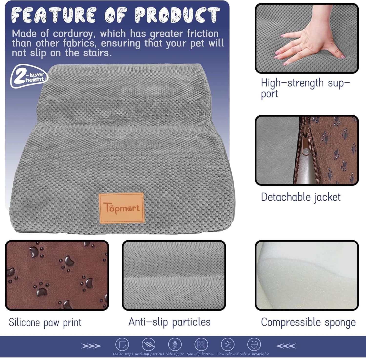 • Safer,Wider&Deeper Steps:Our dog stairs are excellent for those older dogs who are less mobile as they age or for cats with injuries. More wide and deep steps are helpful for reducing the strain that constantly jumping up and down onto lower bed,sofa can have on your pet's joints,and Topmart dog steps will not shake and slip during use. The cover made of corduroy is more frictional than other covers, pets will not slip on the stairs.