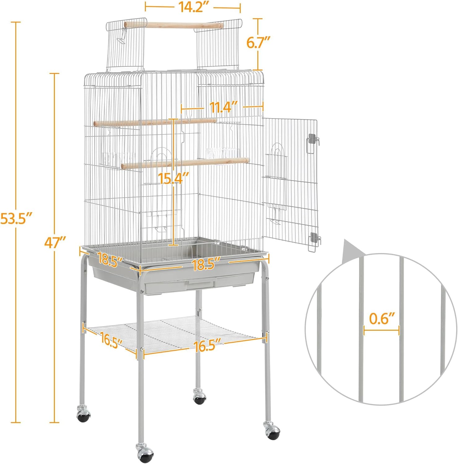 • Extra Accessory Storage: Another thoughtful design for pet parents is the extra storage shelf on the stand. It can keep bird cage cleaning tools, bird seeds and toys handy and neat
