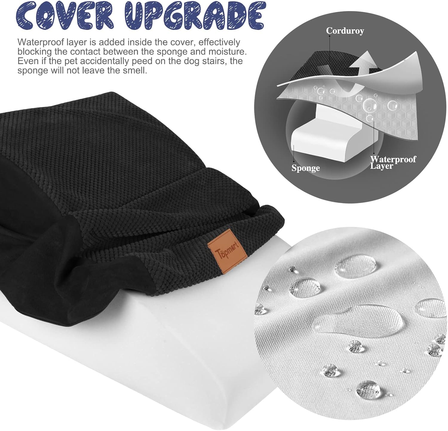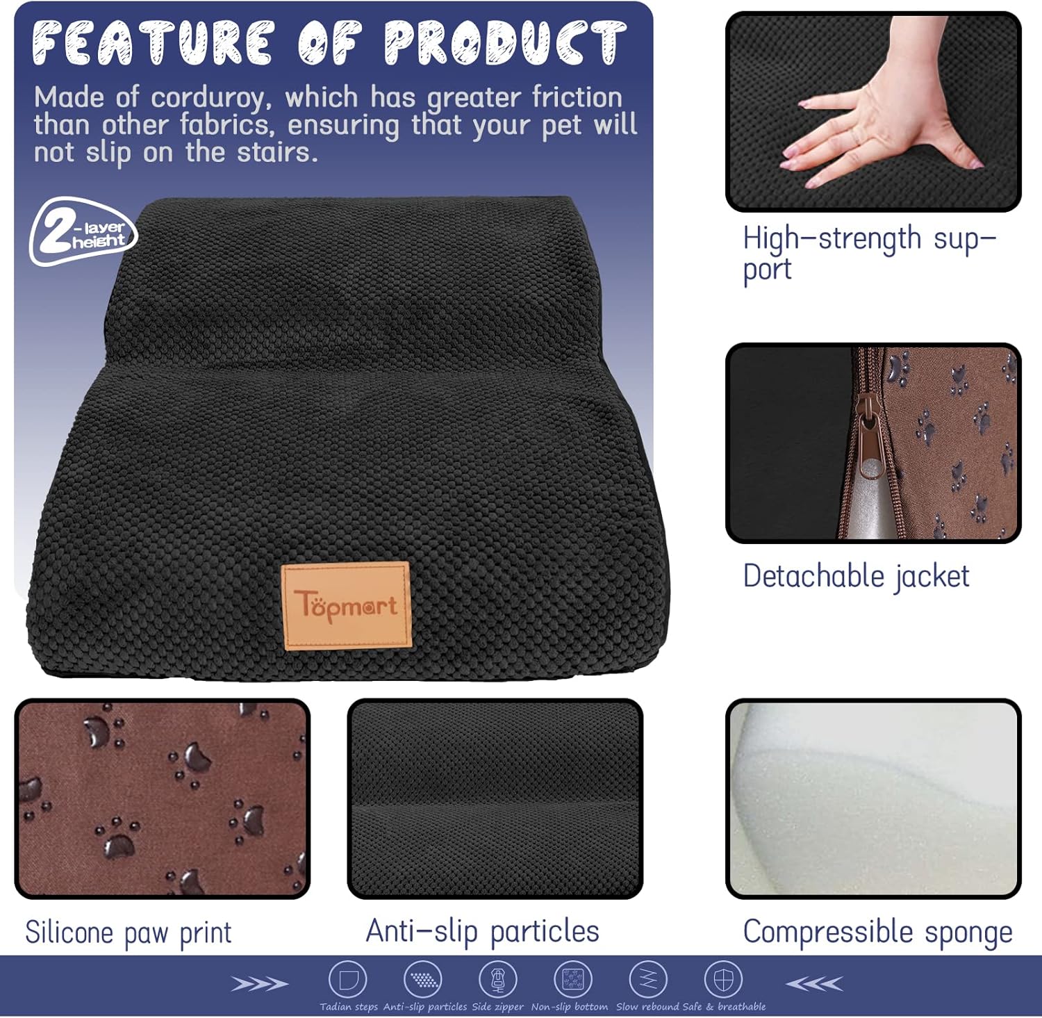 • Safer,Wider&Deeper Steps:Our dog stairs are excellent for those older dogs who are less mobile as they age or for cats with injuries. More wide and deep steps are helpful for reducing the strain that constantly jumping up and down onto lower bed,sofa can have on your pet's joints,and Topmart dog steps will not shake and slip during use. The cover made of corduroy is more frictional than other covers, pets will not slip on the stairs.