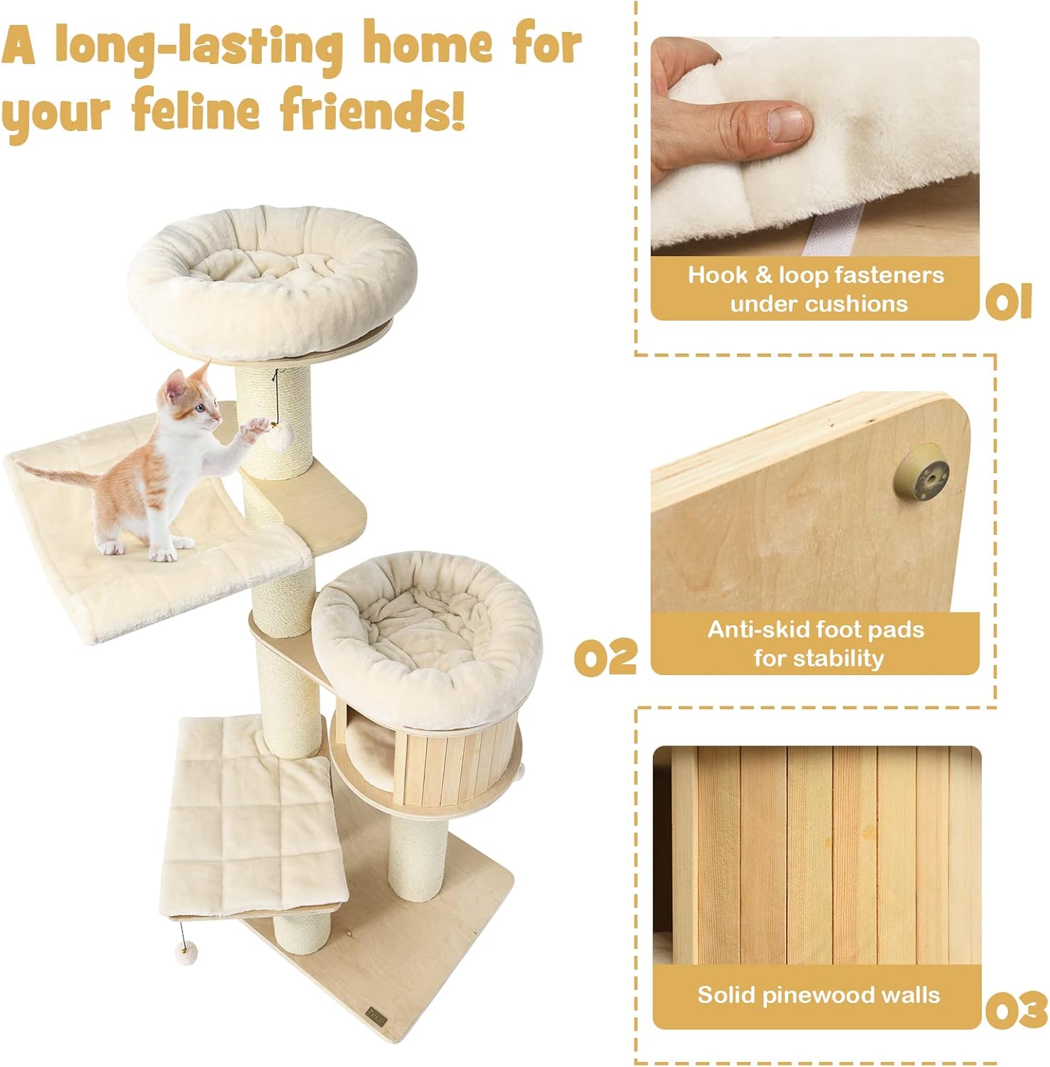 - [Satisfy Cats’ Instinct of Scratching]: Immerse your cat in the joy of claw care with our large cat tree's sisal-wrapped scratching posts. Crafted from natural sisal rope, these posts offer the perfect outlet for nail sharpening, ensuring your cat's well-being while safeguarding your delicate furniture from unsightly scratches. Let your feline companion indulge in this satisfying and stylish scratching experience.