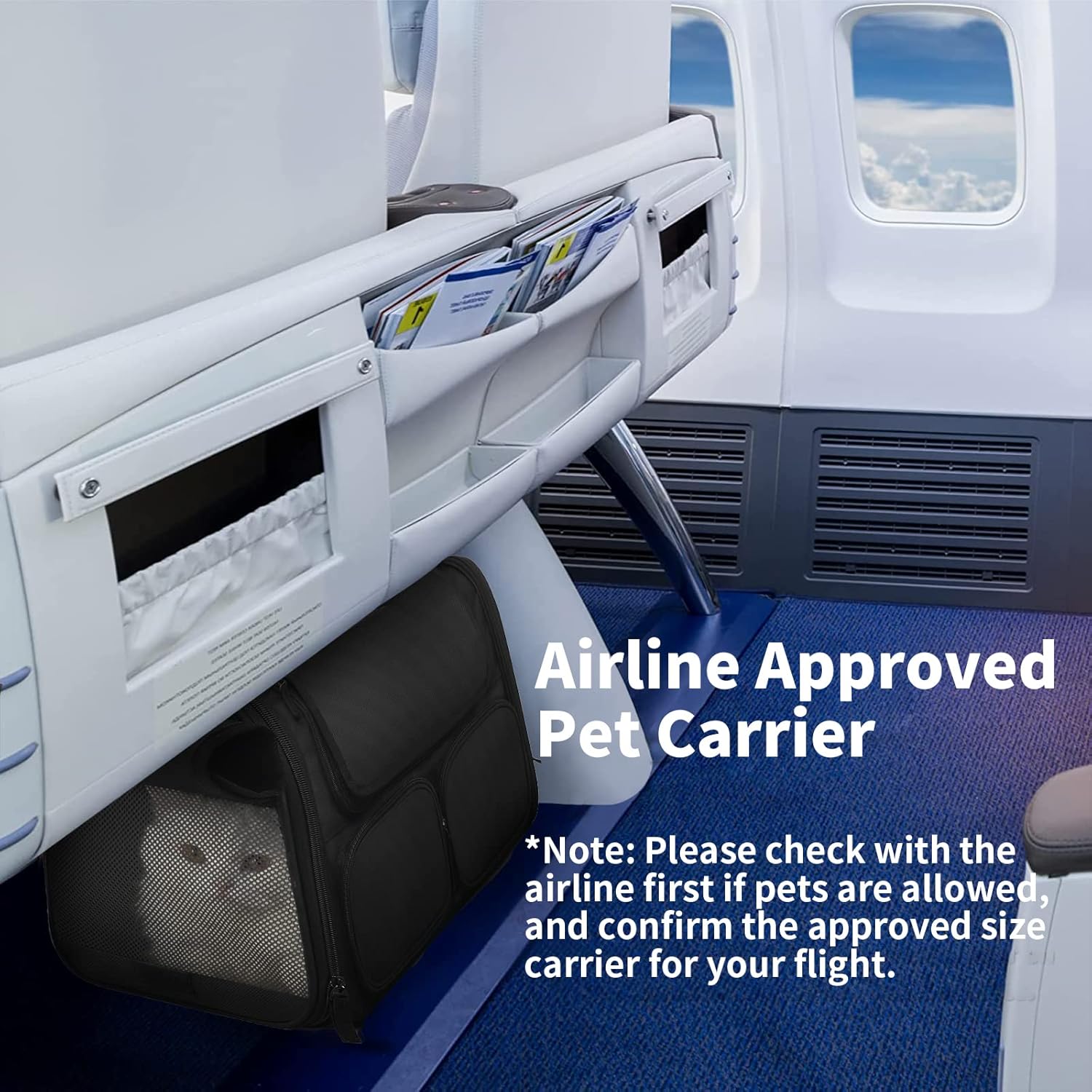 • Airline Approved Pet Carrier - Accepted by most airlines, and designed with a Ventilated Top to meet all airline regulations, so your furry friend can safely lie under the seat in front of you during your trip. Carrier Bag measures 17.5"L x 11.8"W x 11.4"H. Please check with the airline first if pets are allowed is necessary, and confirm the approved size carrier for your flight.