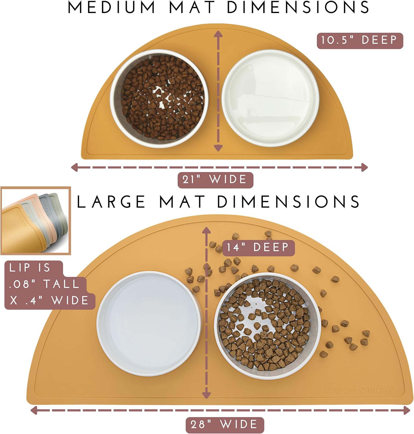 • CONTROL SPILLS AND MESSES: Our silicone pet food mat with a raised edge helps keep spills and messes on the mat. The medium size mat is 21" across x 10.5" deep. It works with bowls that are 7.5" across or smaller. The lip is .2" tall and .4" wide.