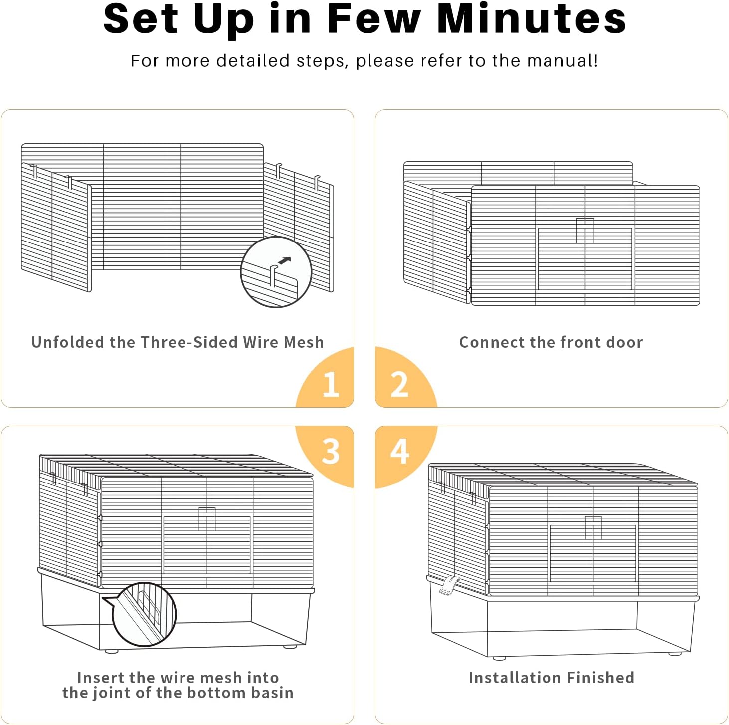 • Easy Assembly: Setting up the cage is hassle-free, thanks to the straightforward assembly instructions and included tools. Within 3 minutes, you'll have a secure and functional home for your furry companion.