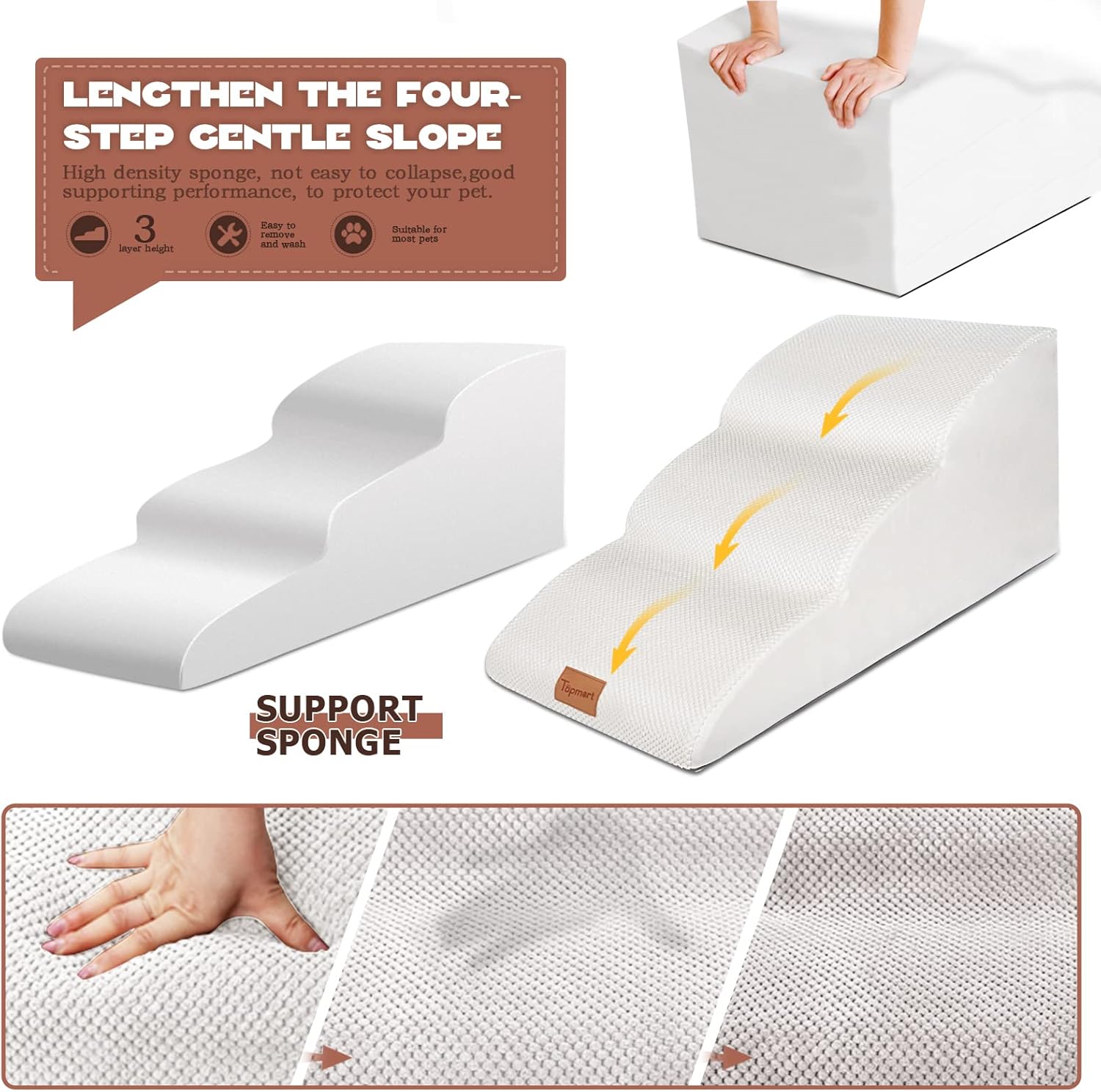 • Upgrade: Compared to the original model, we lengthened each step by 2 inches and each step is larger, increasing the safety of the product while providing a smoother climbing environment for older or leg-injured pets. Cover added waterproof layer to protect the sponge from getting dirty. Even if the pet accidentally pee on the dog ladder, will not leave a mark on the sponge.
