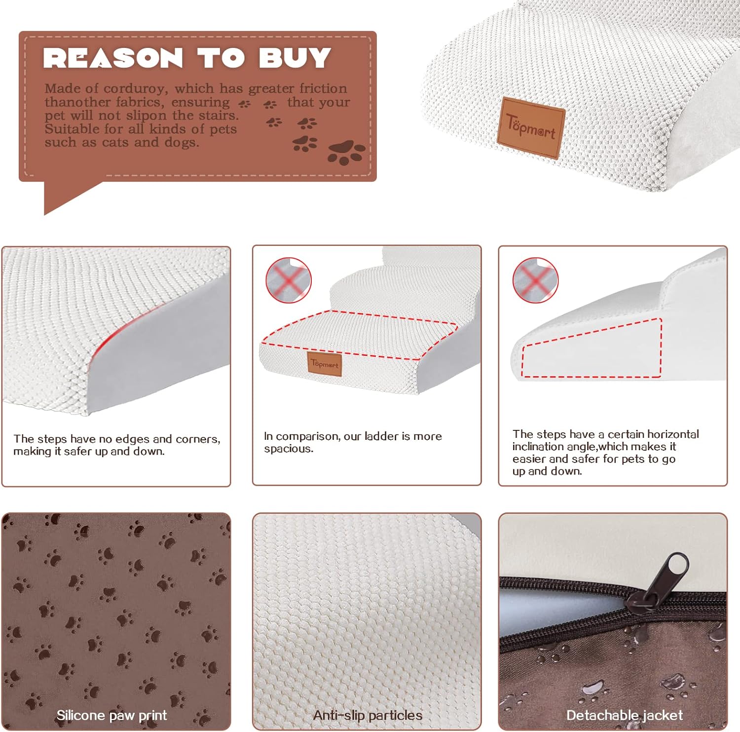 • Safer,Wider&Deeper Steps:Our dog stairs are excellent for those older dogs who are less mobile as they age or for cats with injuries. More wide and deep steps are helpful for reducing the strain that constantly jumping up and down onto lower bed,sofa can have on your pet's joints,and topmart dog steps will not shake and slip during use. The cover made of corduroy is more frictional than other covers, pets will not slip on the stairs.