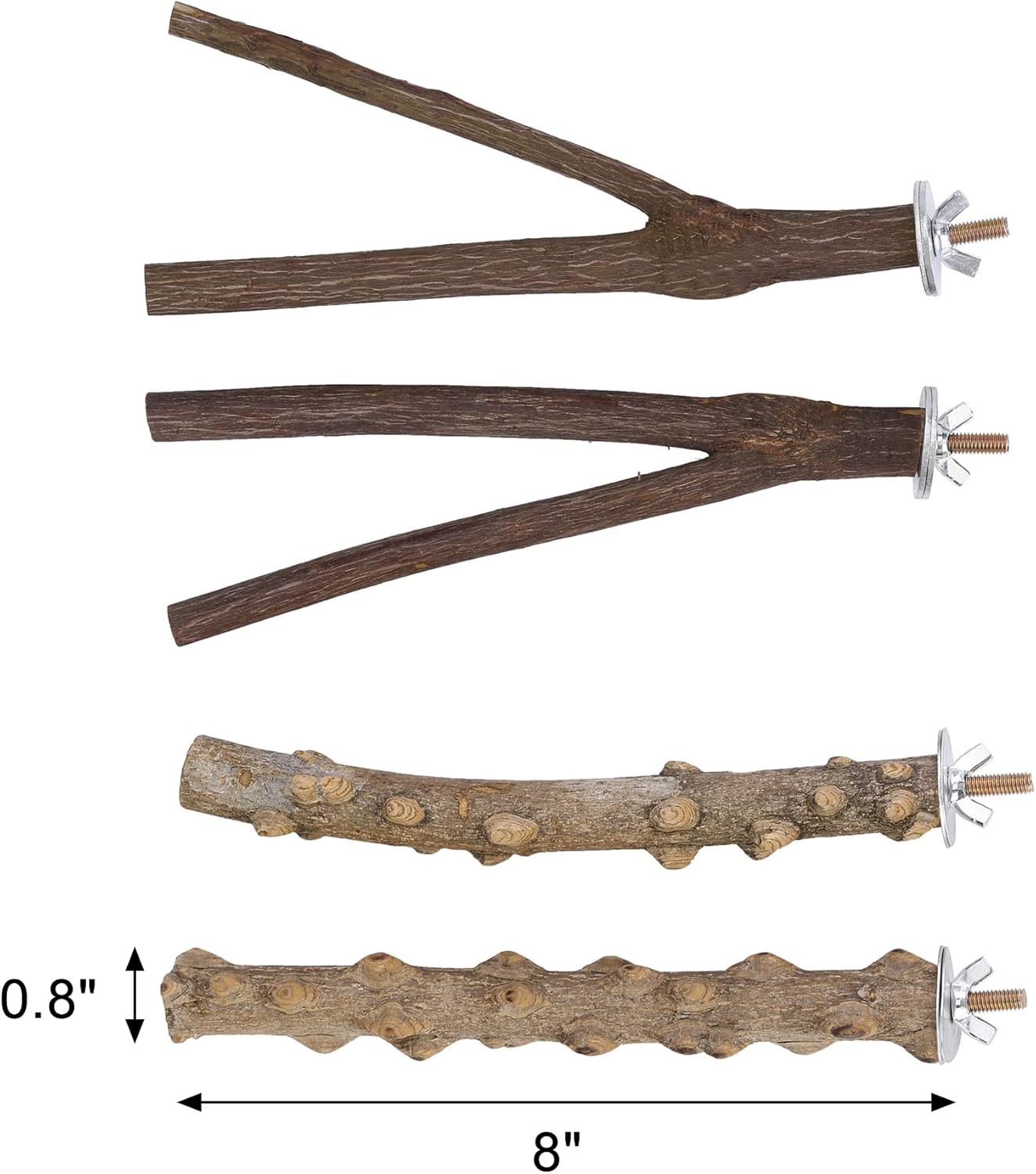 • 【Size】: Y-shaped bird perch*2, straight-shaped bird perch *2, approx 7.9” long and 0.8” in diameter. Each wood perch is able to accomodate 3-4 birds at the same time, perfect for budgies, conure, parakeets, cockatiels, lovebirds or other small birds.