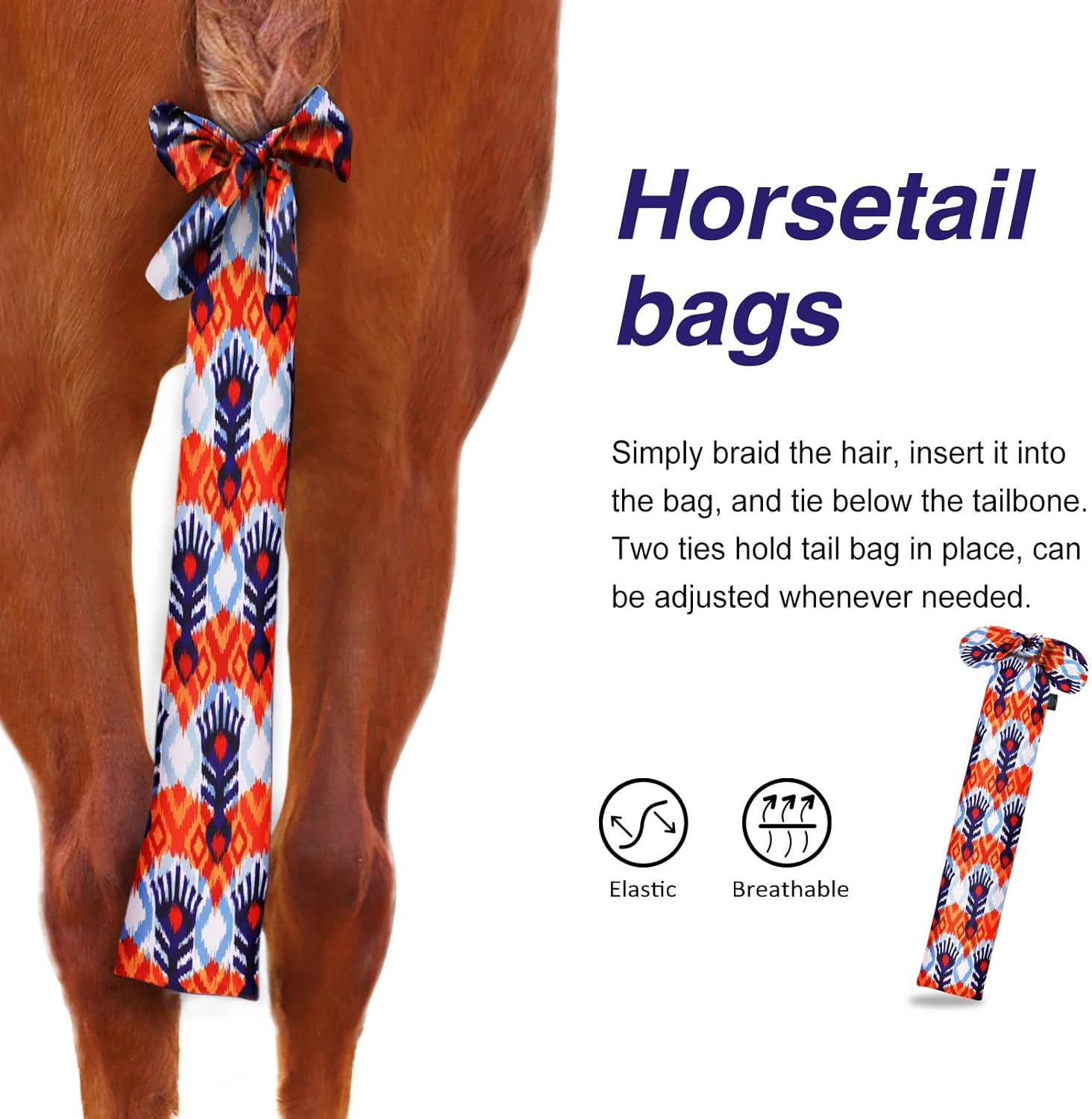 • Adjustable Fit: There is no touch-and-go closure to pull on tail hairs and no fleece to absorb the tail hair’s natural moisture. Simply braid the hair, insert it into the bag, and tie below the tailbone. Two ties hold tail bag in place, can be adjusted whenever needed