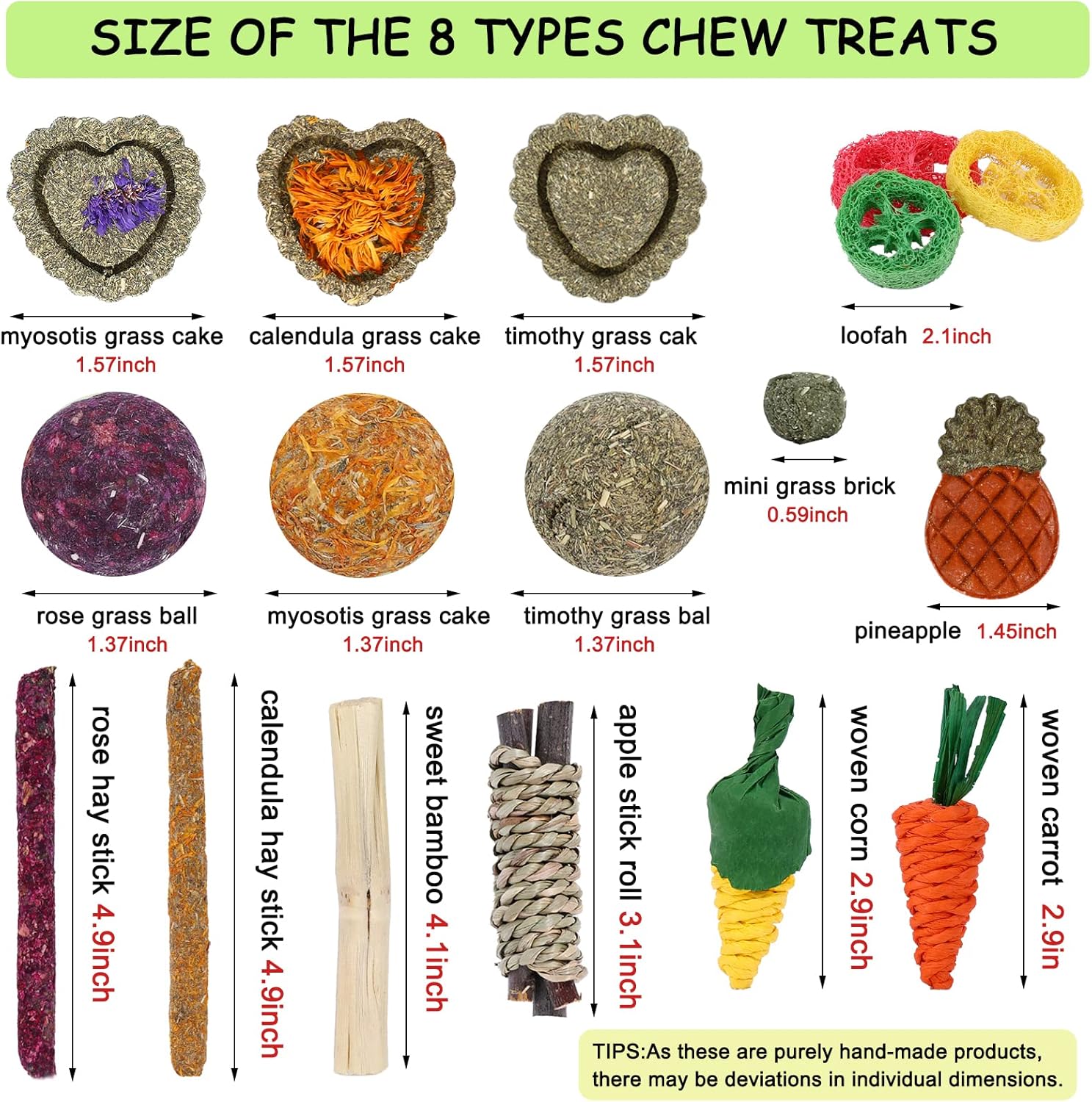 • 【SUPER VALUE PACK】 our rabbit toys set includes pineapple chew toy×1:timothy grass cake×1; calendula grass cake×1 ; myosotis grass cake ×1; timothy grass ball×1; calendula grass ball×1 ; rose grass ball ×1; calendula hay stick ×1;rose hay stick×1; woven carrot×1 ; apple stick roll×1 sweet bamboos×2; woven corn×1; mini grass bricks×4 ; loofah toys×3, enough quantity for your little pet to play and chew.